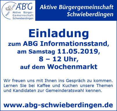 Lesen Sie den Beitrag des ABG-Vereins in den Schwieberdinger Nachrichten Nr. 19/2019 mit einer Einladung zum Wahlinformationsstand des ABG-Vereins am 11.05.2019 auf dem Schwieberdinger Wochenmarkt.