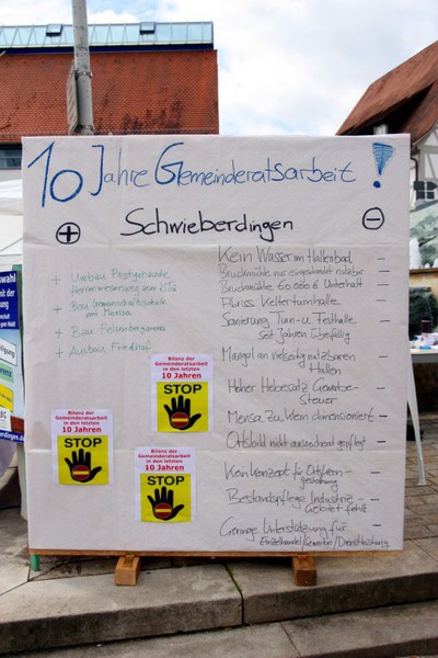 Beim zweiten Marktgespräch wurde das Thema Bürgerbeteiligung in den Fokus gestellt. Anhand der Gemeinderatsarbeit wurde mit vielen interessierten Bürgern über die Bilanz der letzten 10 Jahre gesprochen und diskutiert. Was wäre mit frühzeitiger Beteiligung der Bürger anders verlaufen?