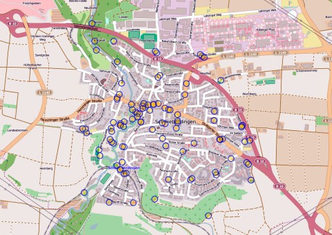 Jetzt braucht es nur noch eine Information, wo es den nächsten öffentlichen Mülleimer gibt. Den dorthin gehört der Müll. Basierend auf Karten von OpenStreetMap - Deutschland wurde eine Karte mit den Standorten der öffentlichen Mülleimer in Schwieberdingen erstellt. Jeder Kreis entspricht einem Mülleimerstandort.