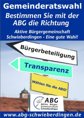 Bleiben Sie uns weiterhin treu und nutzen Sie das umfangreiche Informationsangebot der ABG. Werden auch Sie für ein bürgernahes Schwieberdingen 2015 aktiv.