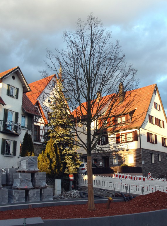 Am Vaux-le-Pénil-Platz wurde die neue Ortslinde gepflanzt. Der Baum hat eine gute Größe und kann nun seinen neuen Standort in Beschlag nehmen.