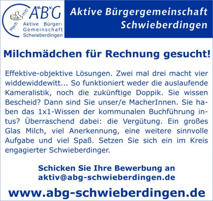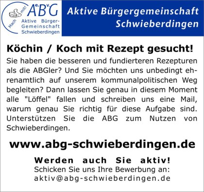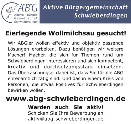Die ABG ist ein kommunalpolitisch tätiger Verein uns sucht stets weitere Mitglieder. Gerade Sie sind uns sehr willkommen. Falls Ihnen unsere Arbeit gefällt und Sie uns unterstützen wollen, dann werden Sie doch ein Mitglied der ABG. Treten Sie ein in die Aktive Bürgergemeinschaft Schwieberdingen!