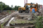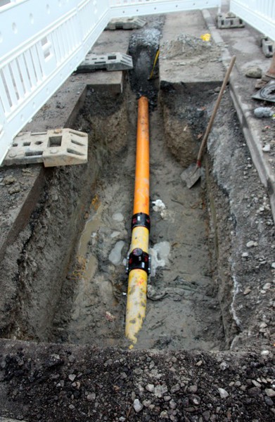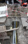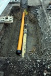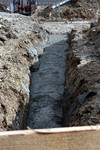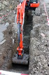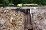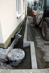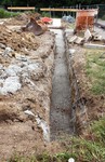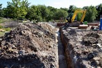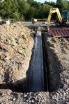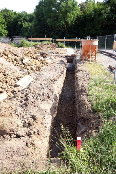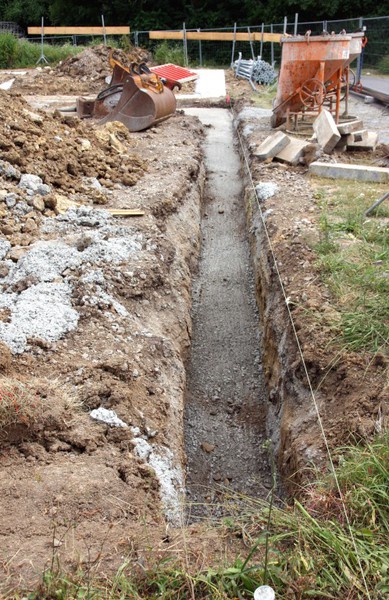 Abwasserleitungen und Heizungsrohre verlegt, mit Sand ummantelt und verfüllt. Nach Abschluss der Rohrverlegung wird dann die Bodenplatte für das Erdgeschoss betoniert werden.