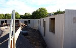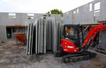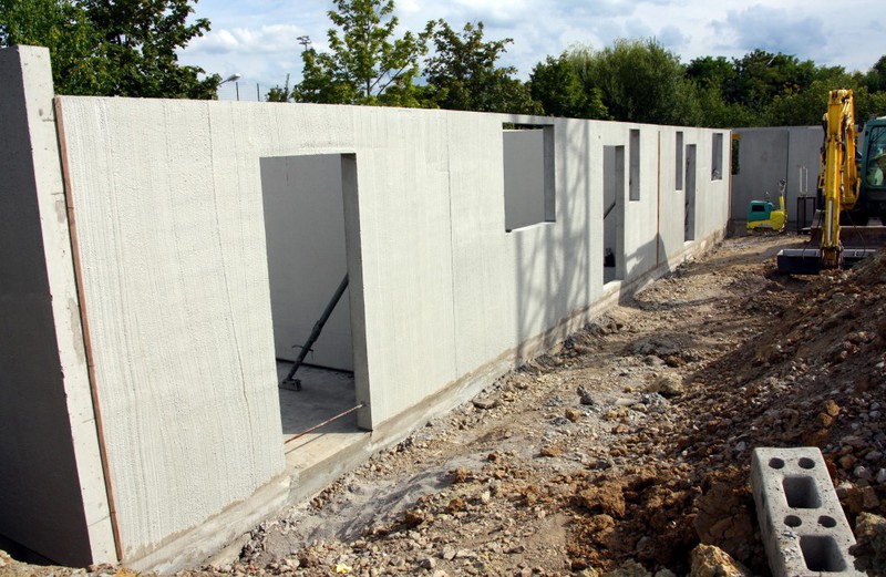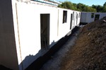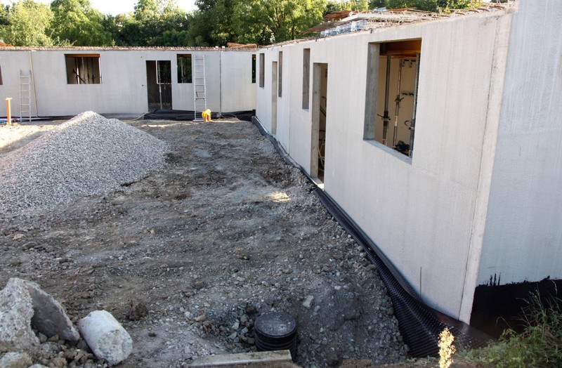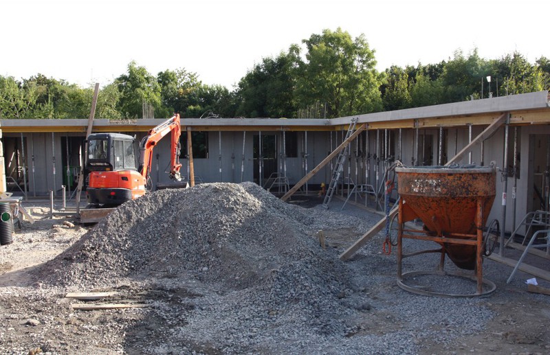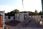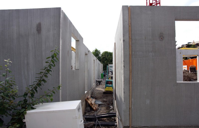 Nachdem die Rohre verlegt waren, konnte die Bodenplatte der Gebäude betoniert werden. Daraufhin sind die Fertigteilwände für das Erdgeschoss geliefert, mit dem Kran an die jeweilige Position gebracht