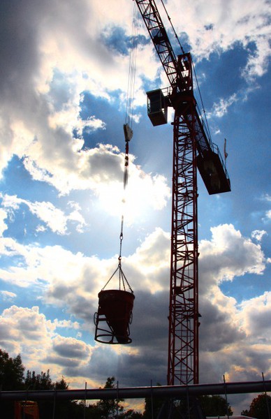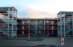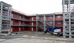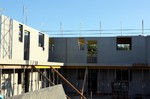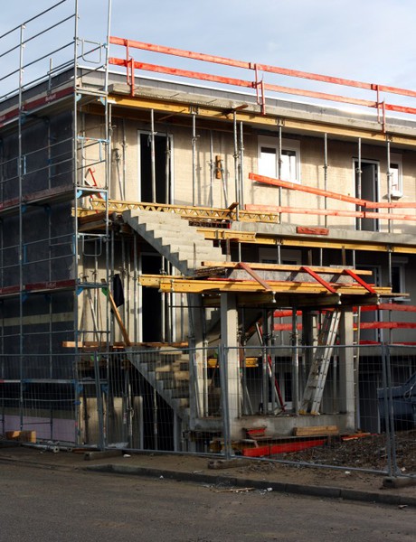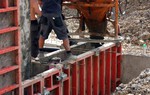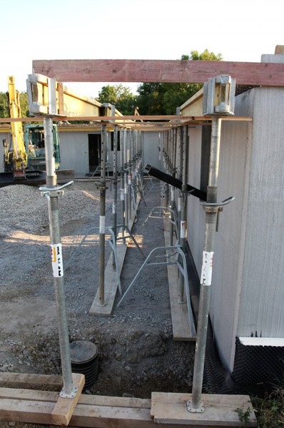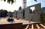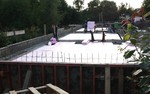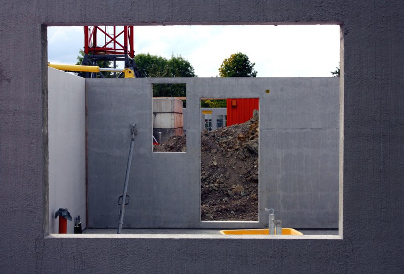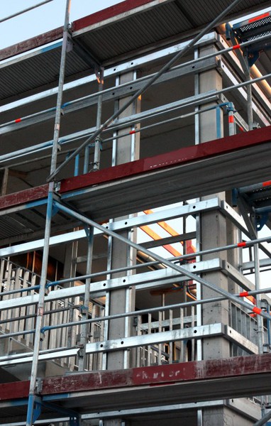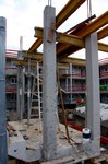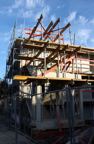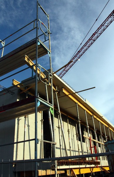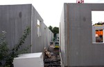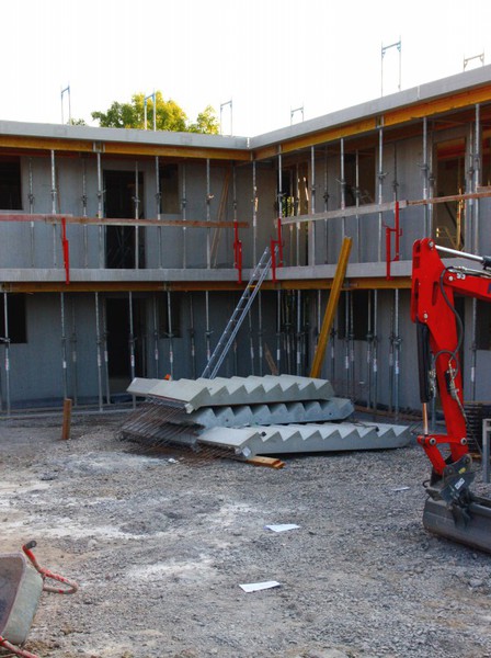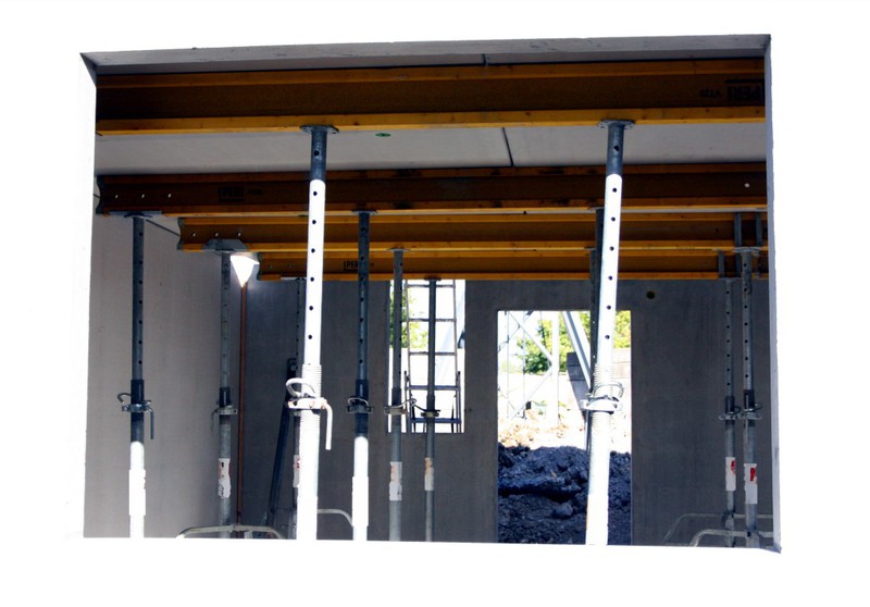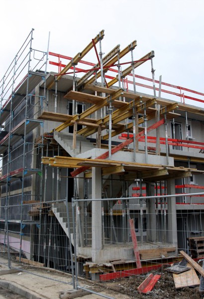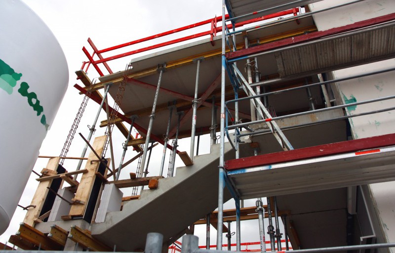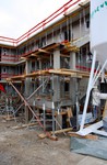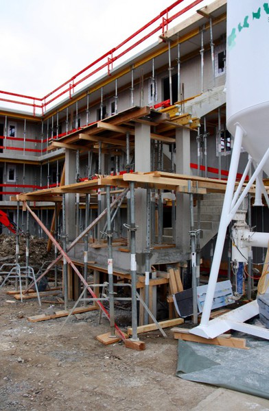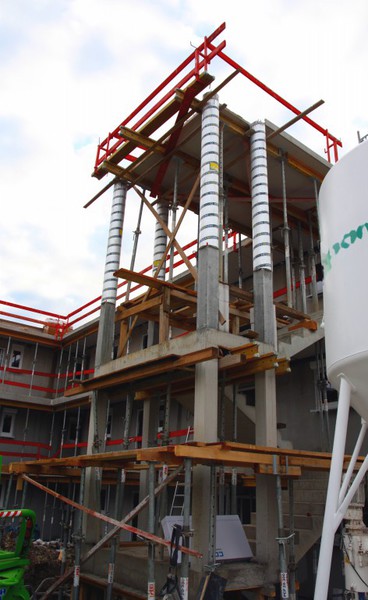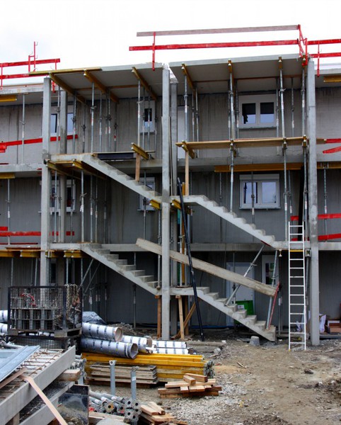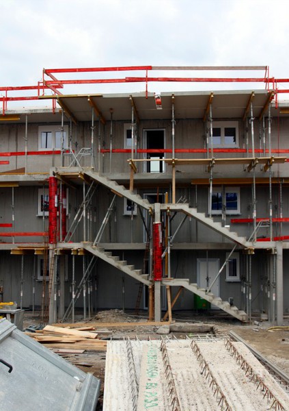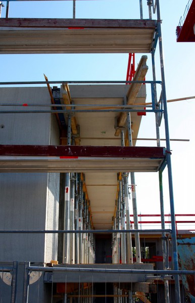 und ausgerichtet worden. Nach Aufstellen der Außen- und Zwischenwände wird als nächstes die Decke ausgebildet, bewehrt und betoniert. Danach wird das erste und zweite Obergeschoss in gleicher Weise