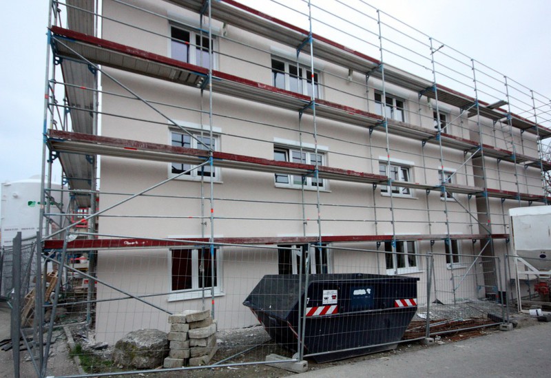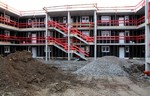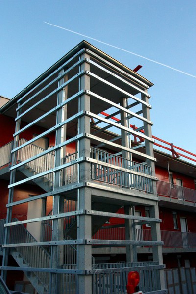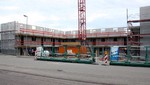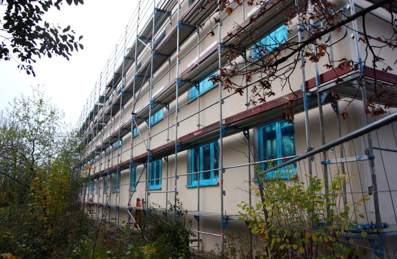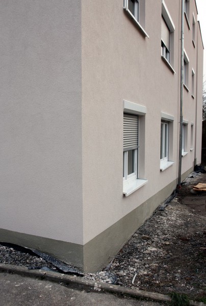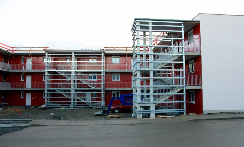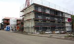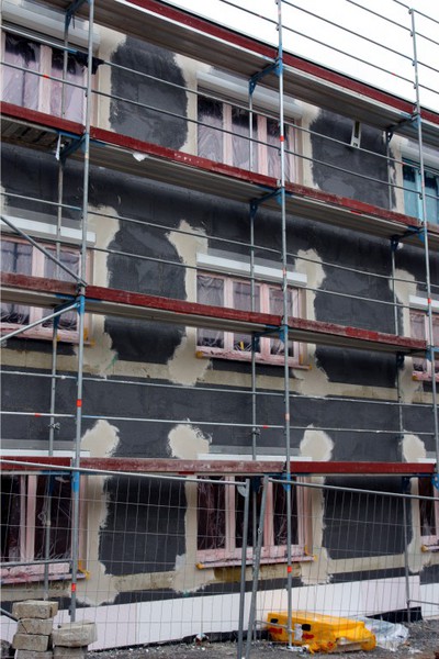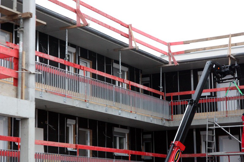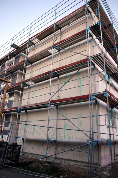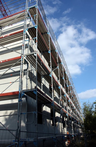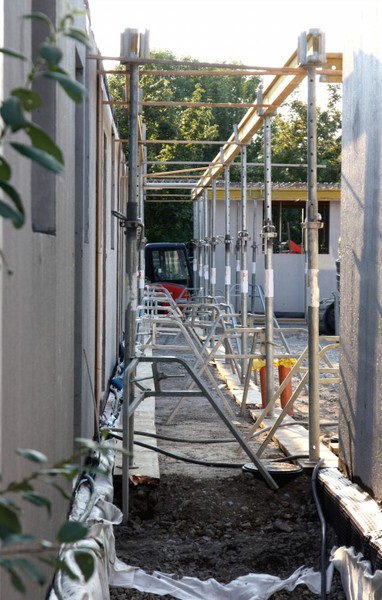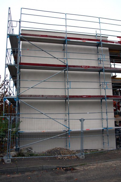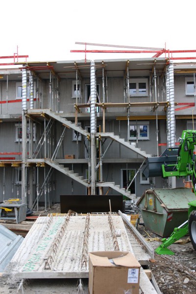 In dieser Woche gibt es wieder mehr Bewegung. Die Treppenhäuser sind verkleidet worden und ums Haus gibt es noch eine Einfassung.