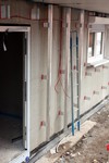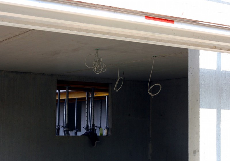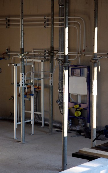 Zeitgleich ist auch der Innenausbau für Heizung, Lüftung, Sanitär im vollen Gange. Es werden die Wasserrohre für den Sanitärbereich verlegt und befestigt wie auch die Unterputzkörper für die