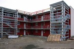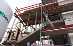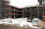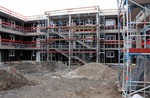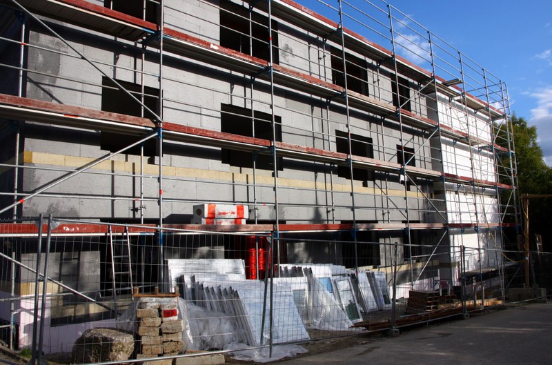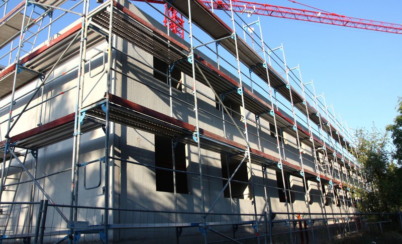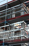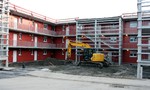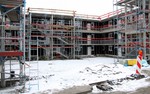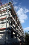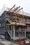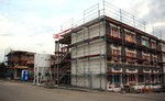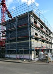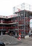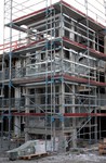 Die erste Etage ist aufgebaut. Zudem hat der Innenausbau schon seit längerem begonnen. Das Gebäude wird eingerüstet.