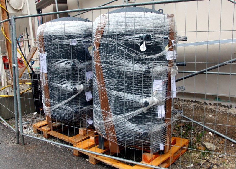 Im Außenbereich sind die Fortschritte übersichtlich. Viele Tätigkeiten gibt es auf dem Dach und im Innenausbau. So werden beispielsweise Kollektoren für die Heizung aufs Dach gesetzt.