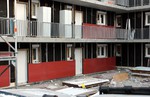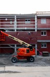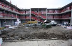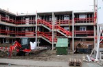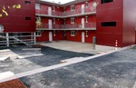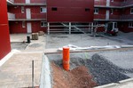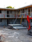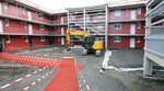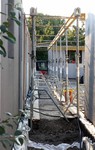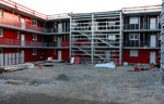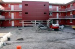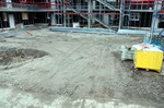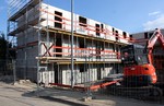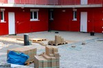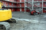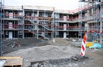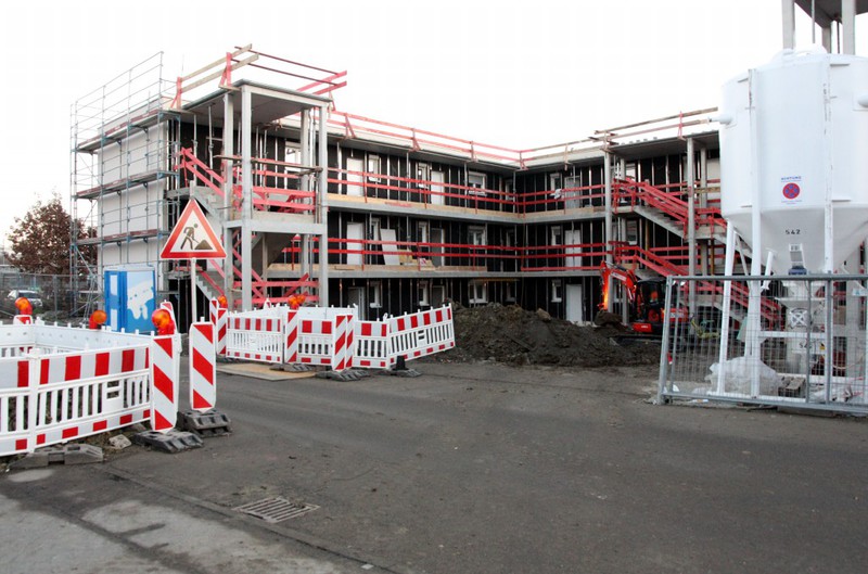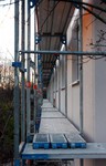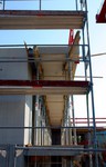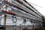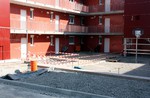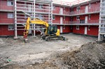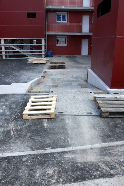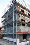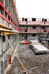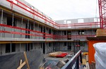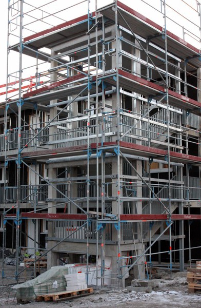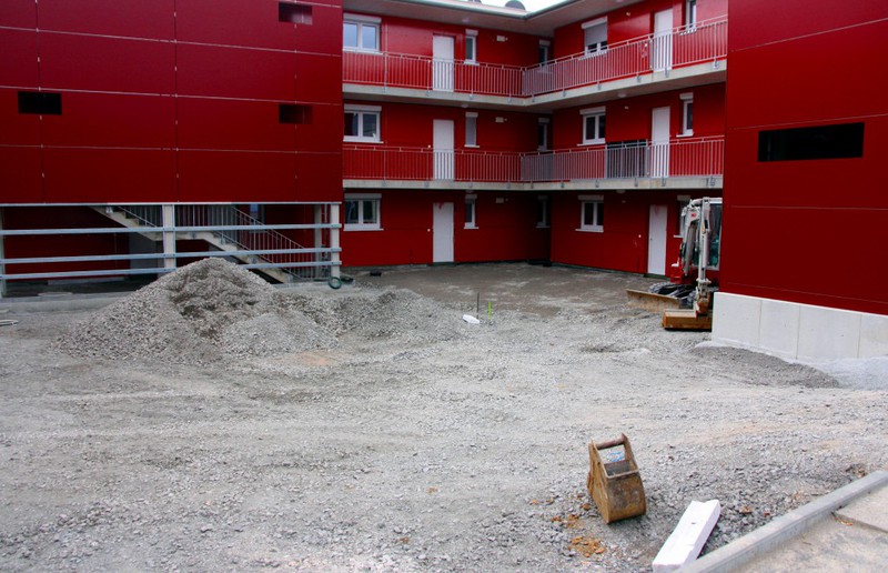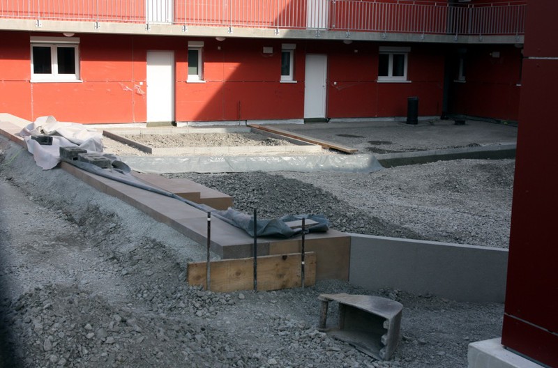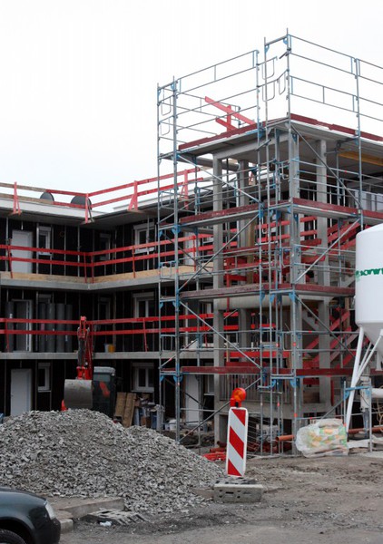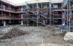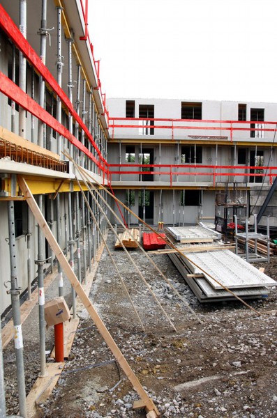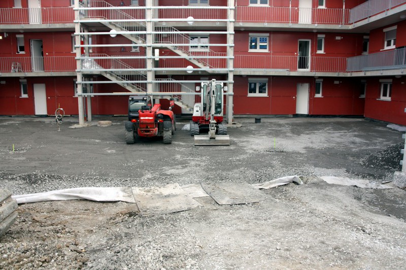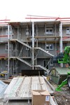 Die Gerüste werden abgebaut und im Innenhof und um die Treppenhäuser aufgebaut. Die Laubengänge bekommen ein Geländer und im Innenhof gibt es Erdbewegungen.