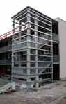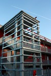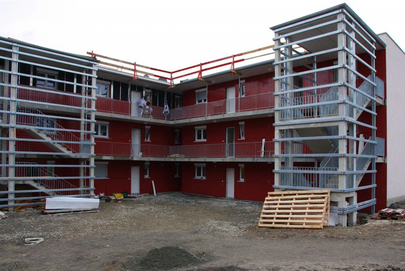 Die Gerüste sind weg. An den Treppenhäusern sind die Verstrebungen für deren Verkleidung angebracht. Bei der Fassade im Innenhof gibt es Fortschritte.