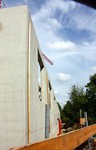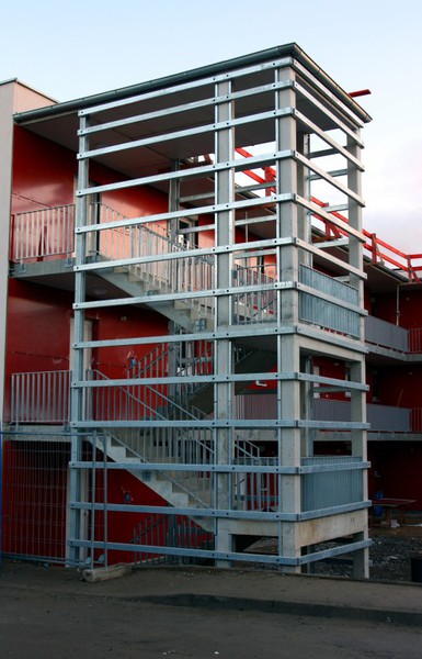 Das mittlere Treppenhaus hat in dieser Woche seine Verkleidung bekommen. Die Sockel der seitlichen Treppenhäuser bekommen auch noch eine Ummantelung.