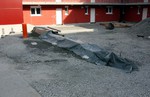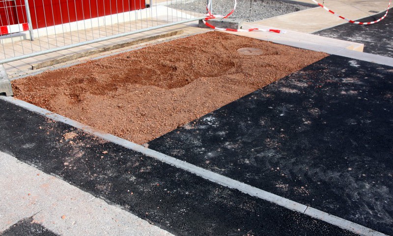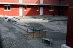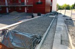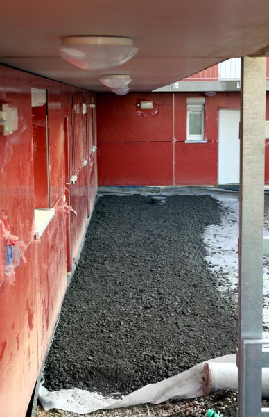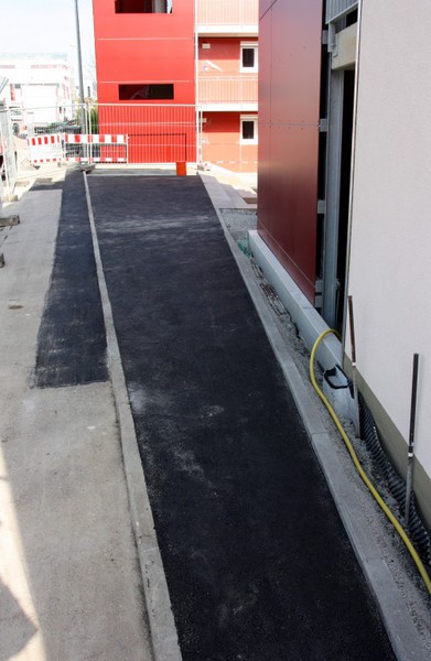 Der Innenhof nimmt so langsam Gestalt an. Die Mitte wurde mit Asphalt versehen und die seitlichen Bereiche mit Pflaster versehen. Pflanzerde für einen Baum ist ebenso schon vorhanden.