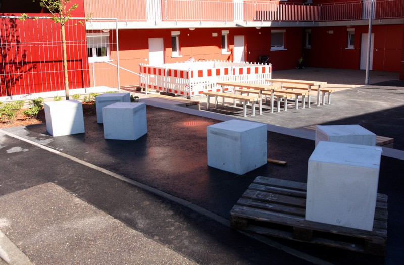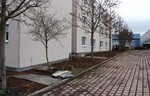 Die beiden Bäume sind gepflanzt. Die Pflasterarbeiten sind fertig und es gibt Licht im Innenhof. Fehlt nur noch der Spielbereich für die Kleinen.