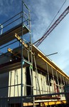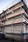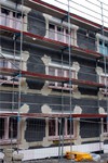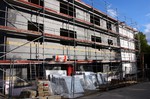In dieser Woche hat sich das Rätsel um das kleine Bauwerk am Rande des Gebäudes aufgelöst: Es wird eines der Treppenhäuser. Des Weiteren wird an der Außenseite die heute übliche Isolierung angebracht.