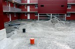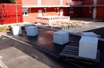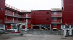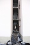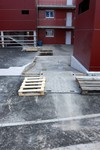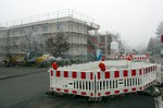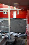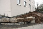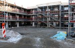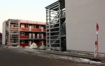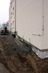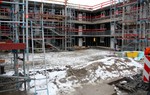 Im Innenhof tut sich nach dem 2. Schneefall ein wenig etwas. Am Sockel des Gebäudes gab es noch einen Schutzanstrich. Zudem neues Material, vielleicht für die Treppenhäuser oder die Verkleidung im Bereich des Innenhofes.