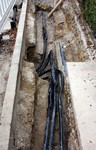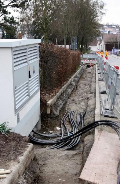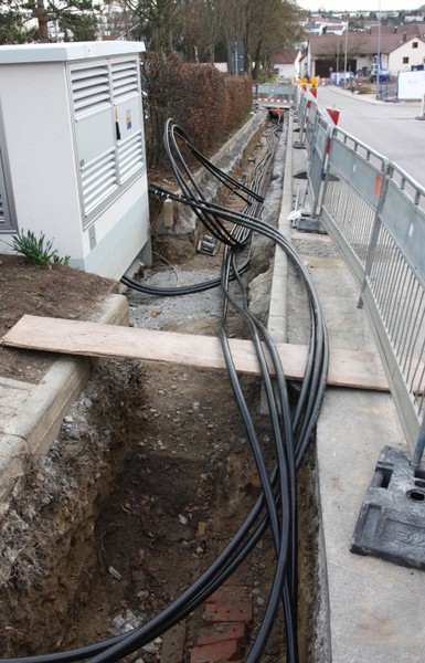 Wie angekündigt wurde in dieser Woche damit begonnen Stromleitungen entlang des Gehwegs am Friedhof zu verlegen. Dieser Schritt ist notwendig, um den Trafoturm auf dem Baugelände entfernen zu können. Diese vorbereitende Maßnahme ist mit 178.980 € beziffert. Eine teure Maßnahme, um das Baufeld vorzubereiten.