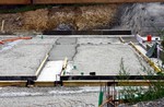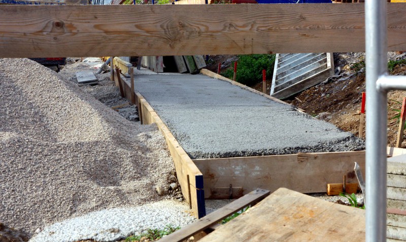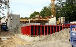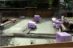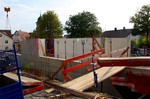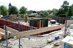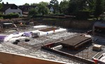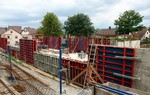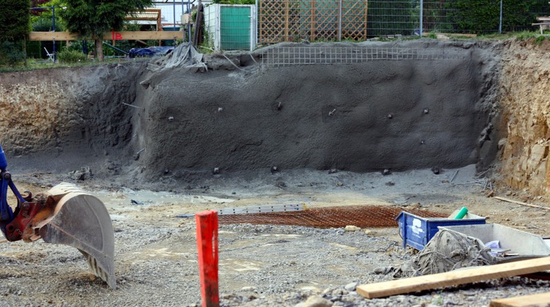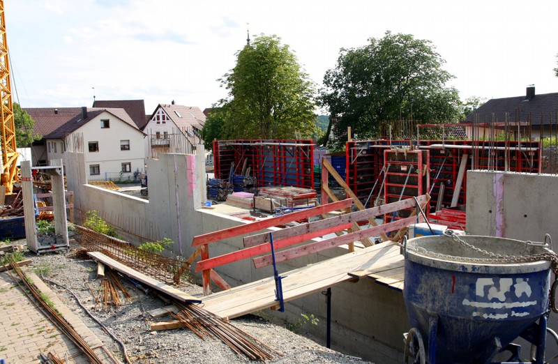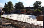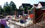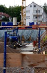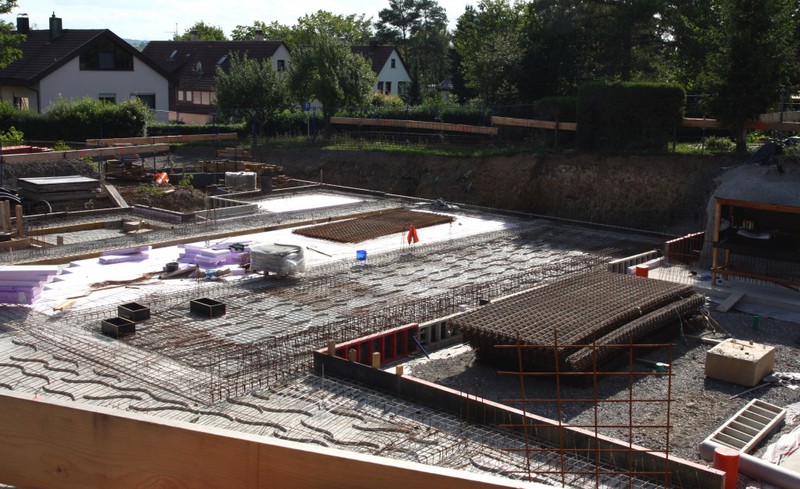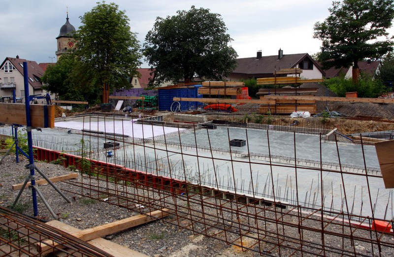 Nachdem in der vergangenen Woche die Bodenplatte teilweise eingebaut worden ist, sollen im Laufe dieser Woche die restlichen Quadratmeter eingebracht werden. Parallel dazu erstellt die Baufirma die