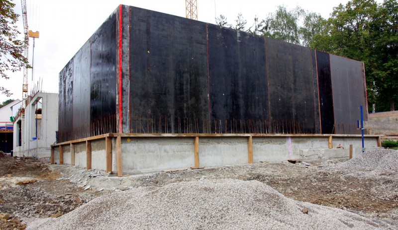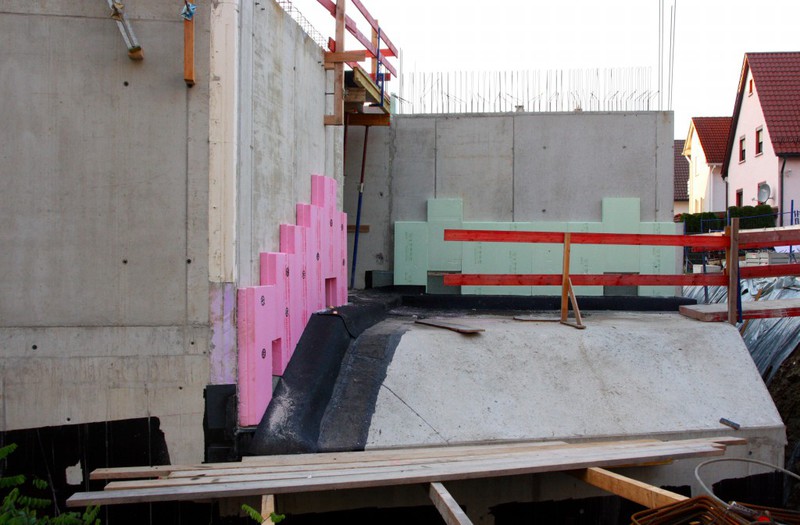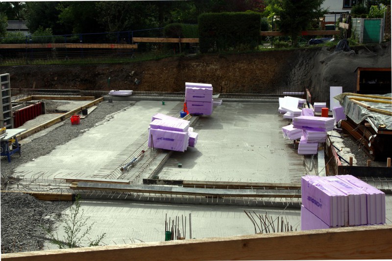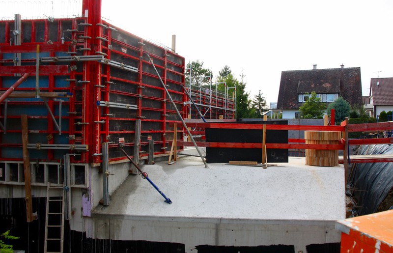 Die Betonarbeiten gehen so langsam ihrem Ende zu. Letzte Verschalungen werden für die Außenfassade angebracht und es muss noch die oberste Decke gegossen werden. An einer Stelle beginnt bereits die Anbringung der Dämmung. Ein Schritt nach dem anderen.
