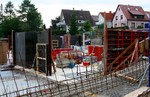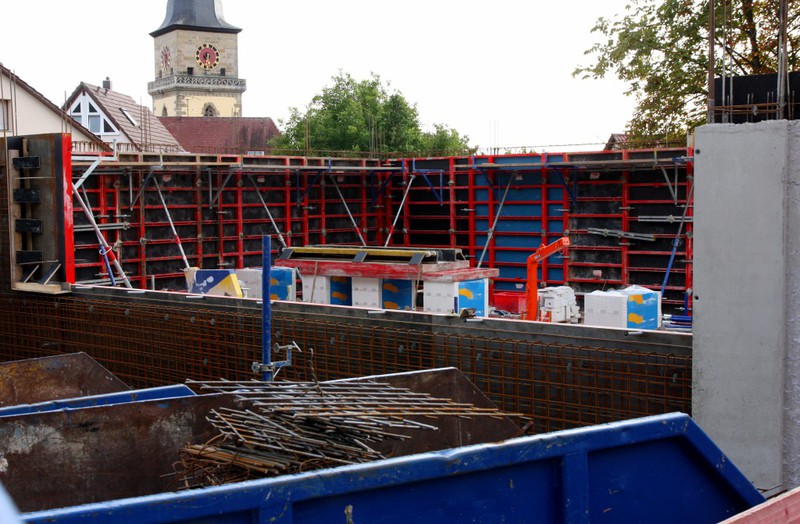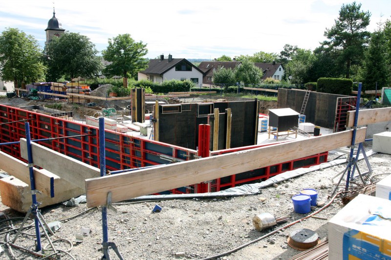 In dieser Woche geht es vorwiegend im südlichen Gebäudeteil weiter. Begonnen über die Fundamente, die Bodenplatte und die Verschalung für die Wände. So stellt man sich eine Baustelle vor.