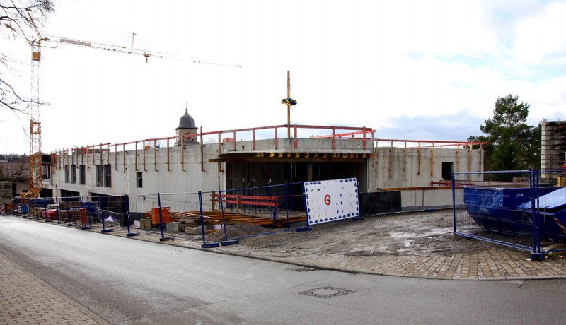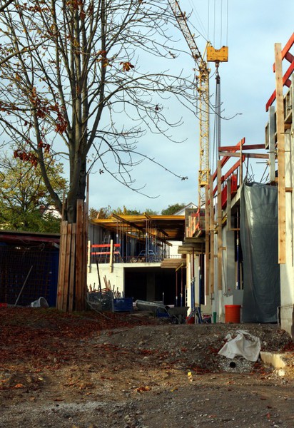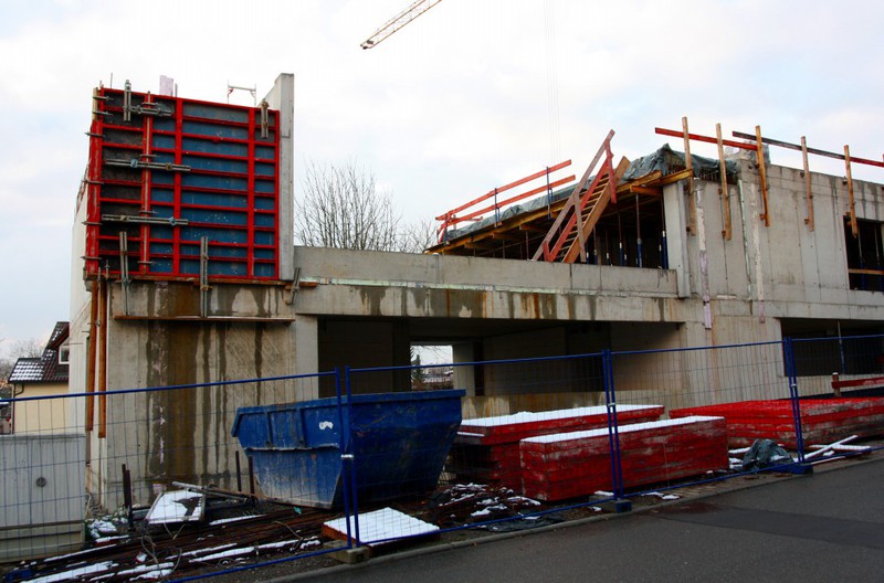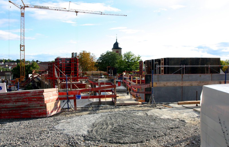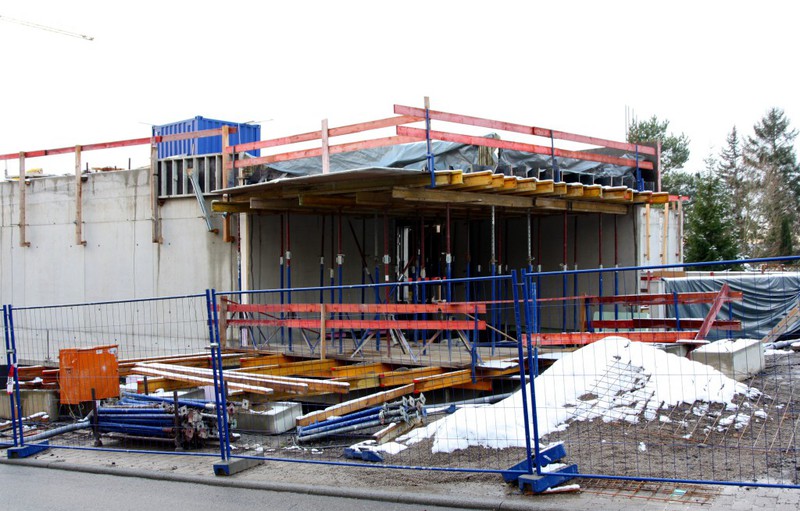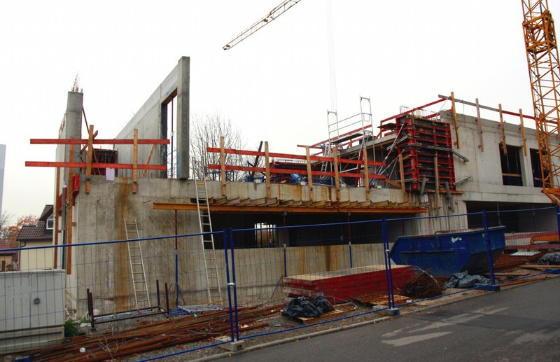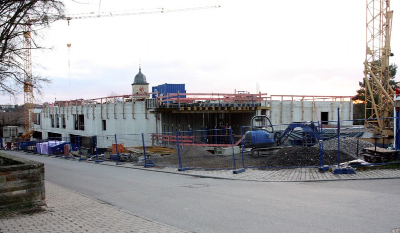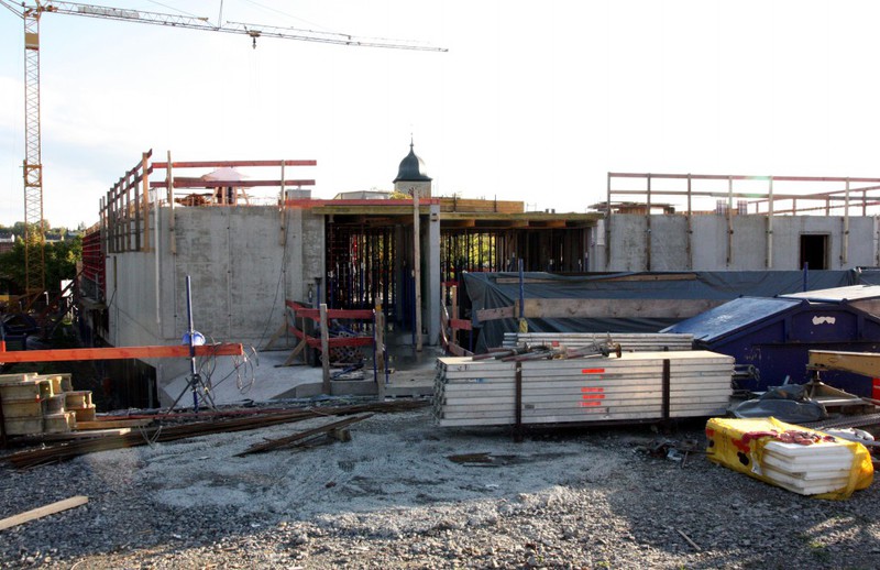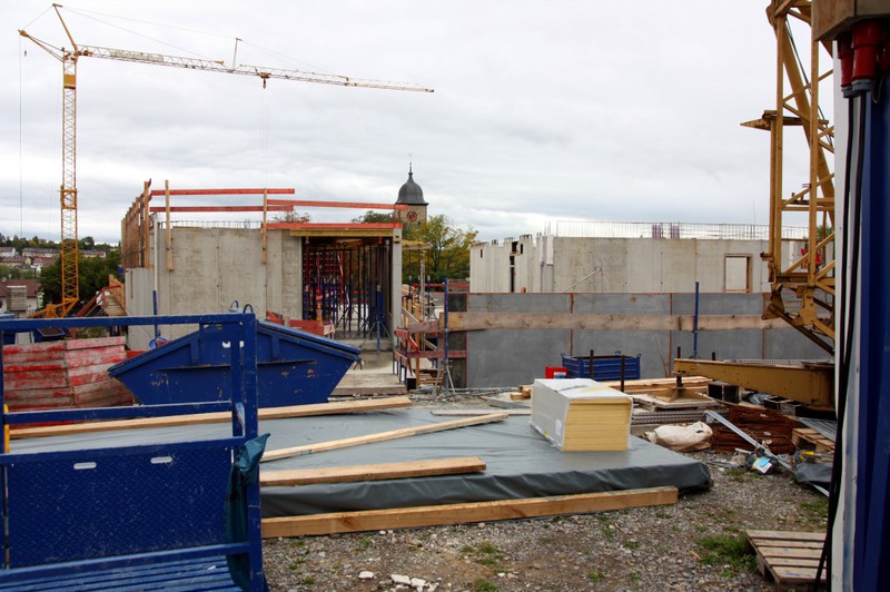 Man kann dem Wachsen des Gebäudes täglich zusehen. Auch am Samstag wird auf der Baustelle gearbeitet. Im nördlichen Teil des Gebäudes ist bereits die erste Decke eingezogen worden. Zu Wochenbeginn benötigte einer der Kräne eine Reparatur.