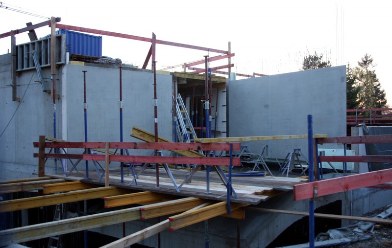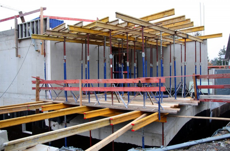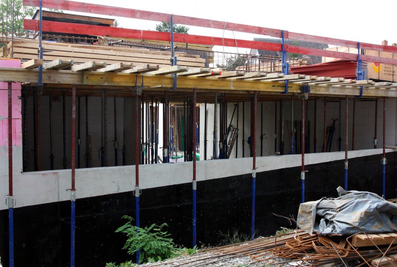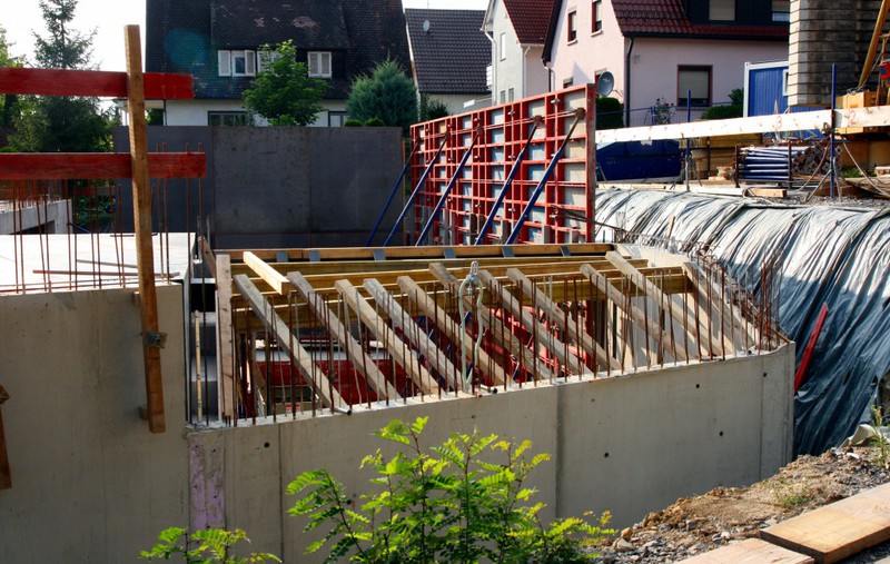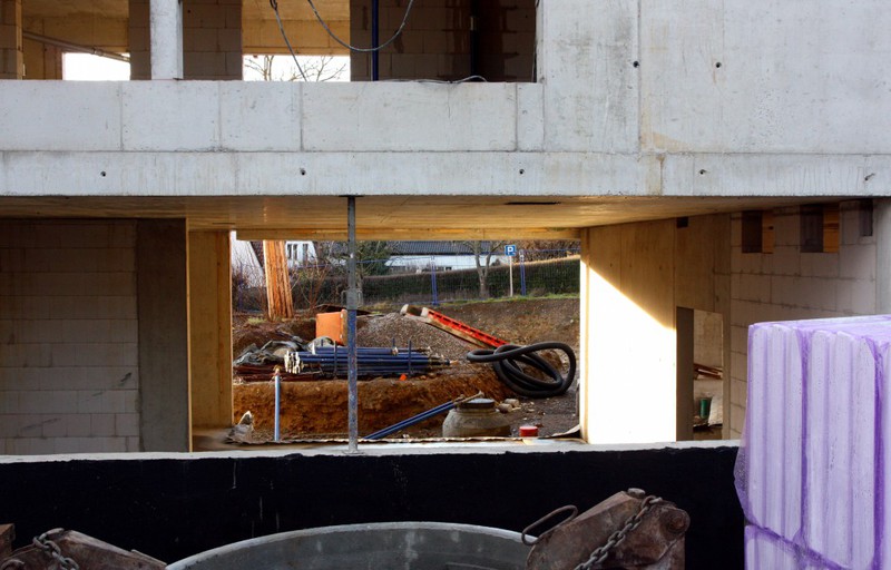 Auch im Untergeschoss werden bald die noch fehlenden Zwischenwände gemauert werden. Bis jetzt stehen noch die Sprieße zur Abstützung der Decke, bis diese vollständig ausgehärtet ist. Das Bild zeigt