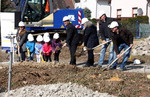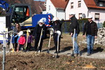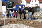 Dann kam der Spatenstich. Neben Bürgermeister Lauxmann und Architekten Zimmermann haben zwei Vertreter der Baufirma und jeweils ein Kind aus den Gruppen des Kindergartens mit Ihrer Leiterin Frau