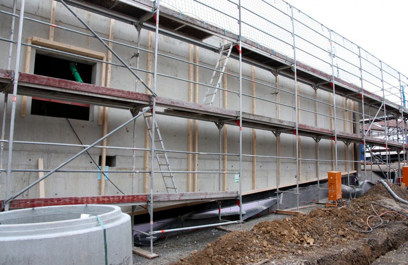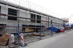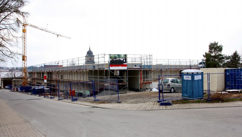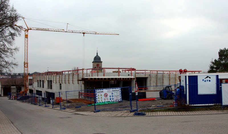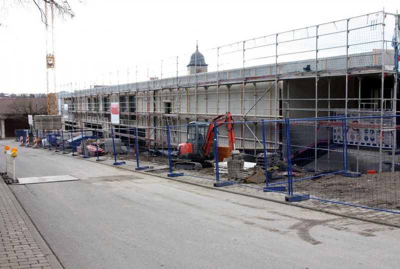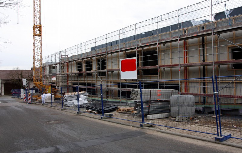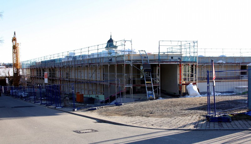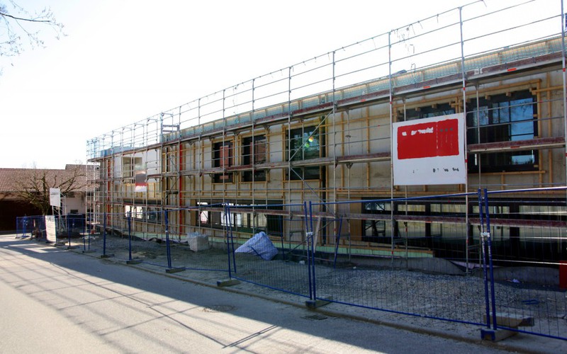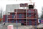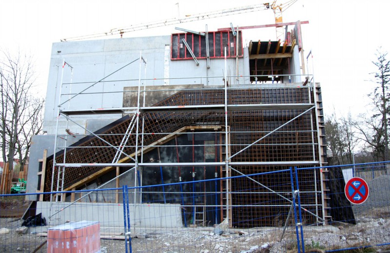 Auf der Baustelle ist die Winterpause vorbei und es geht wieder weiter mit den Bauarbeiten. Am südlichen Gebäudeteil wird eine Treppe gebaut, es wird die Isolierung angebracht und im Eingangsbereich ist das Gerüst entfernt worden.