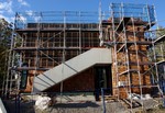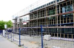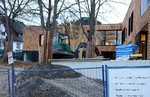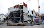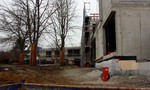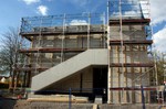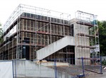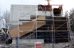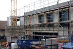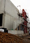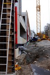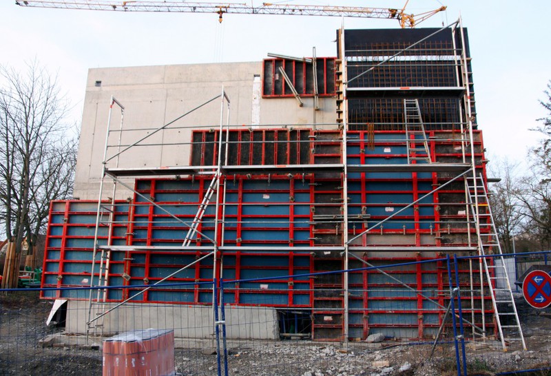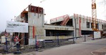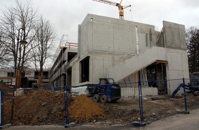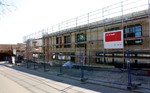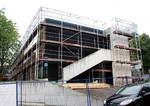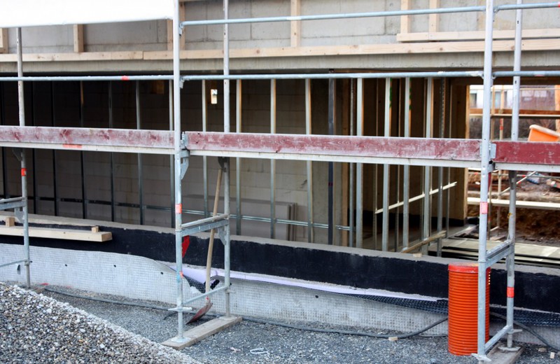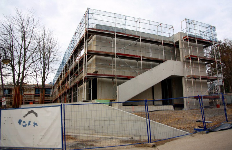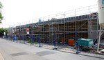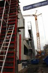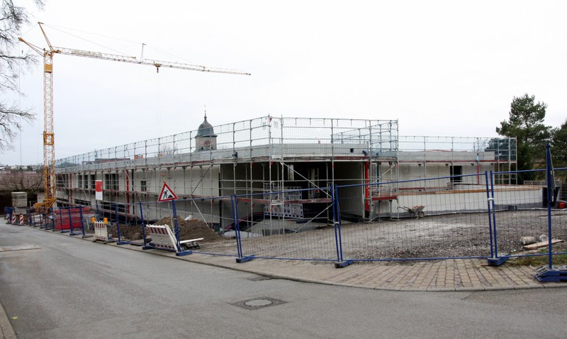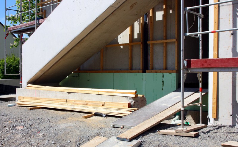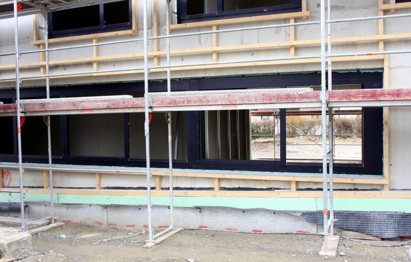 Auf der Baustelle ist die Winterpause vorbei und es geht wieder weiter mit den Bauarbeiten. Am südlichen Gebäudeteil wird eine Treppe gebaut, es wird die Isolierung angebracht und im Eingangsbereich ist das Gerüst entfernt worden.