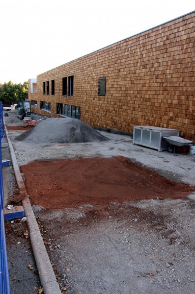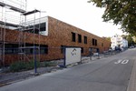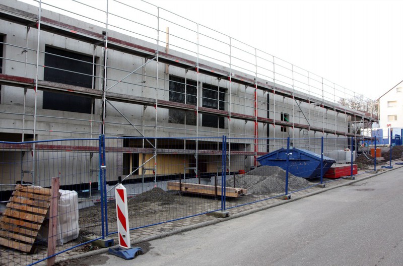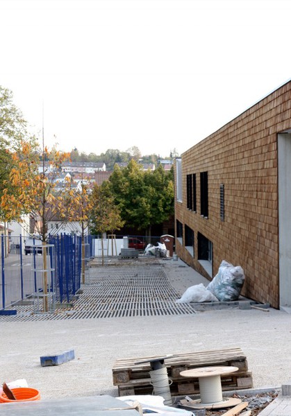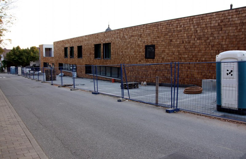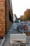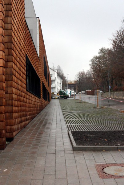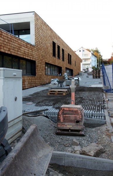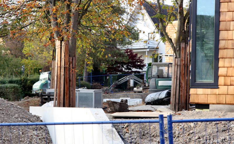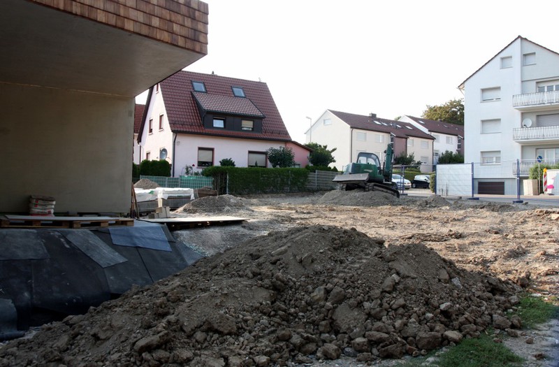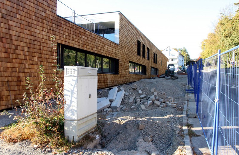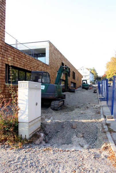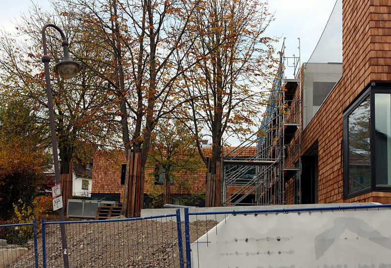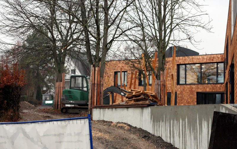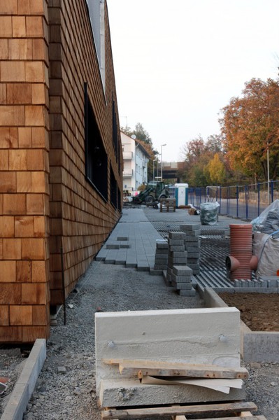 Die Holzbauer sind wieder da und es geht an der Holzvertäfelung weiter. An den Außenanlagen geht es auch weiter. Im Bereich neben der Markgröninger Straße ist eine