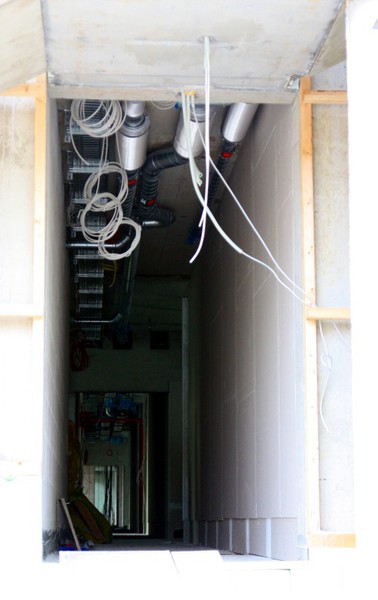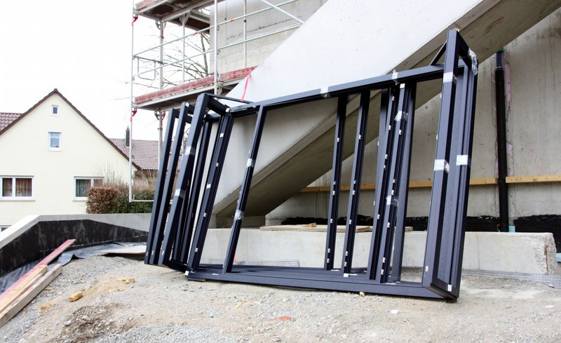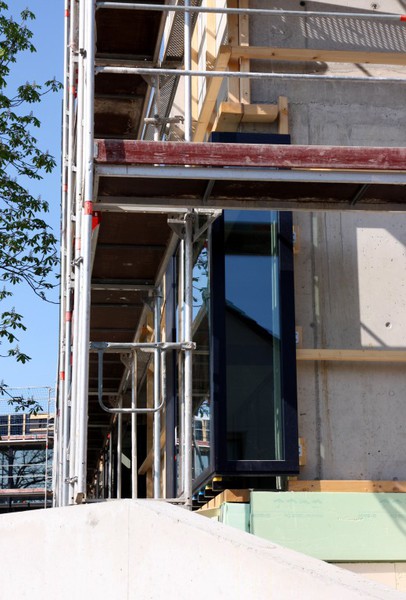 am Werken, was man an den Kabeltrassen sehen kann. Zuletzt sind noch die Fensterrahmen gekommen. Pechschwarz als wären sie aus Kunststoff, aber es sollen ja Holzfenster sein.