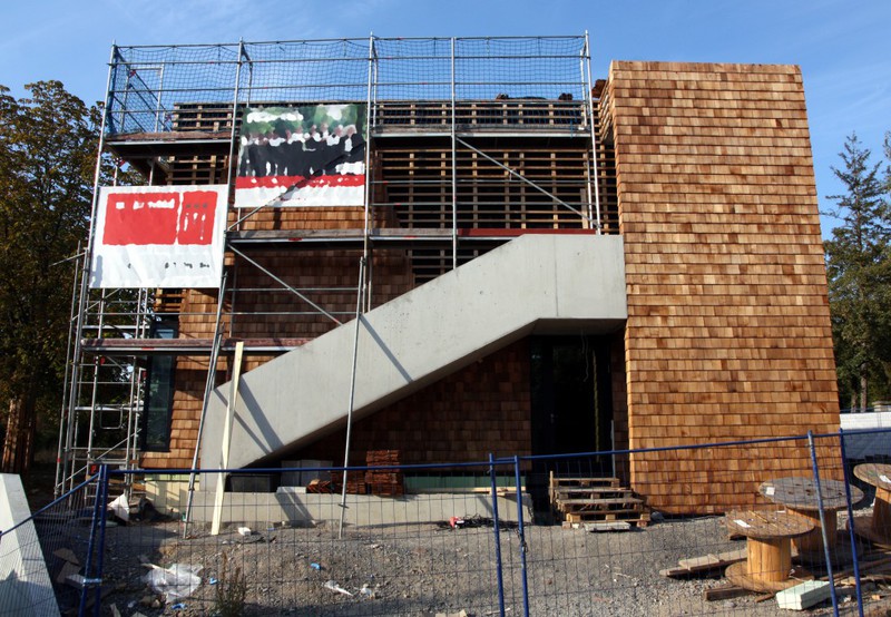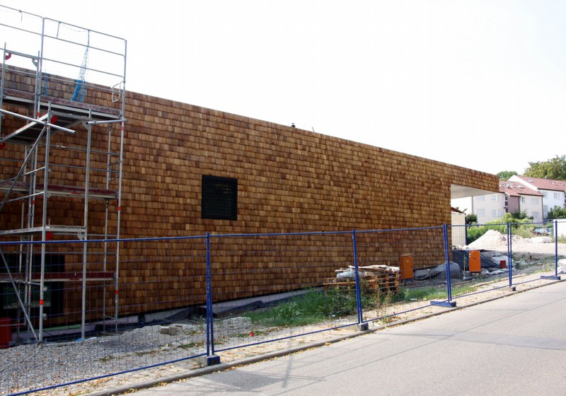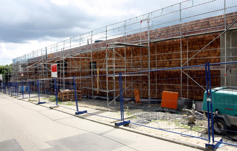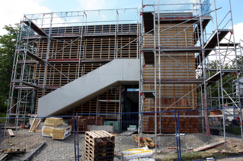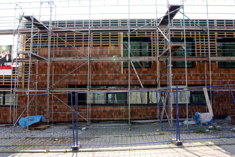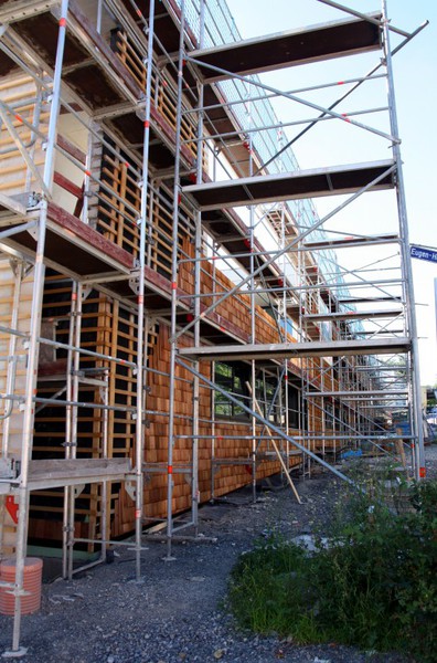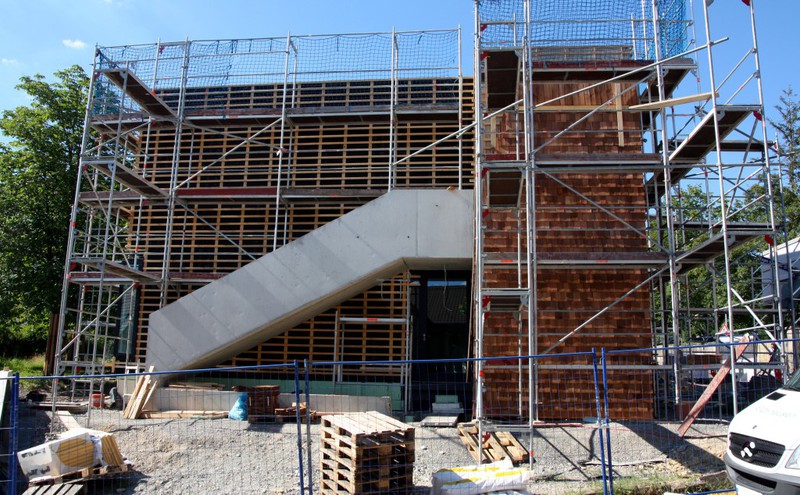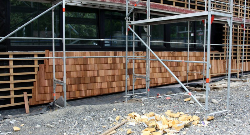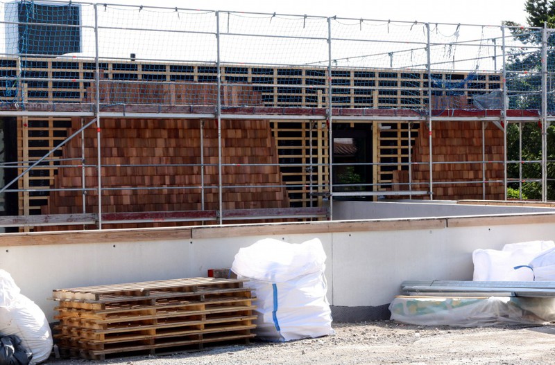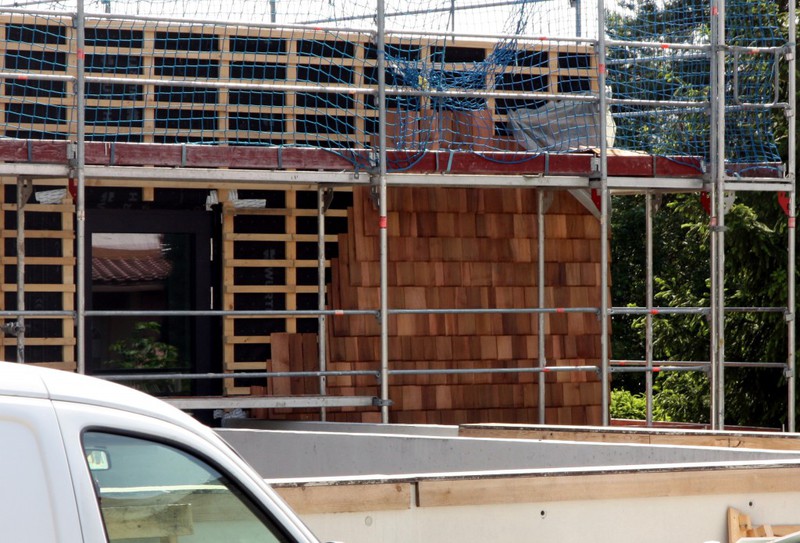 Die Holzfassade wächst weiter. Weshalb an der Südfassade das Gerüst abgebaut wurde, erschließt sich noch nicht. Hier sind nämlich noch keine Holzschindeln angebracht