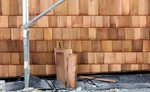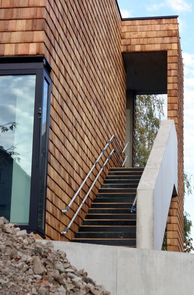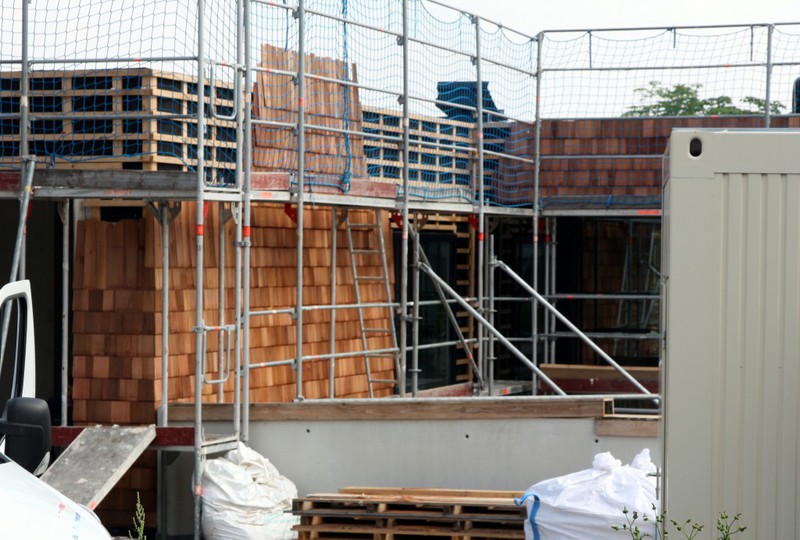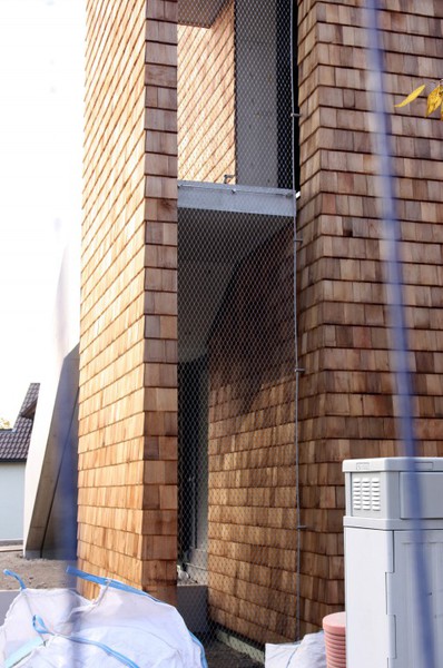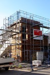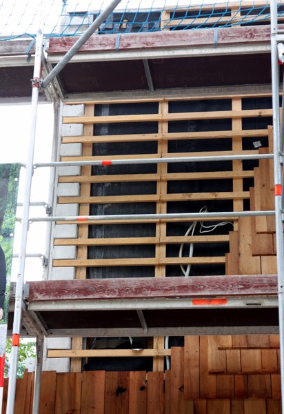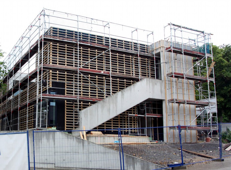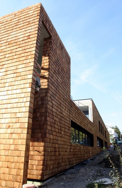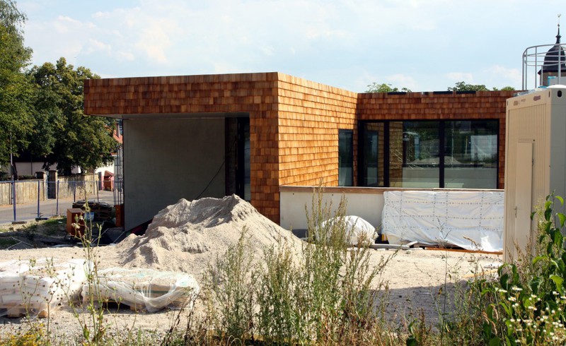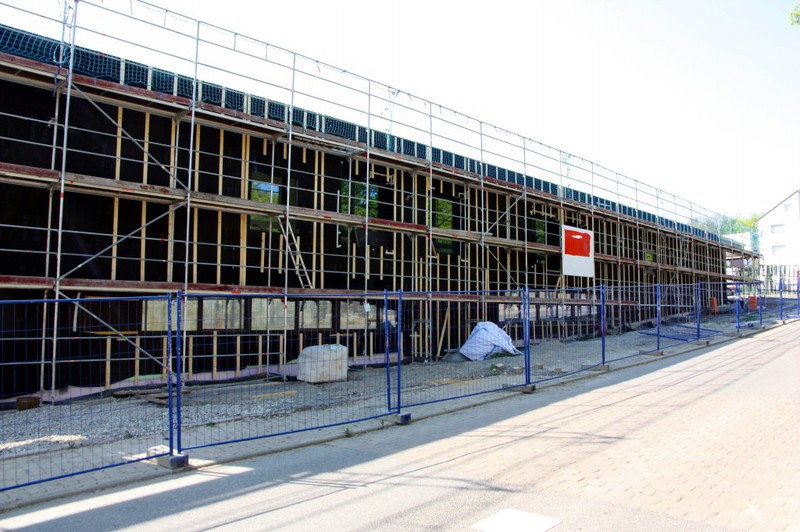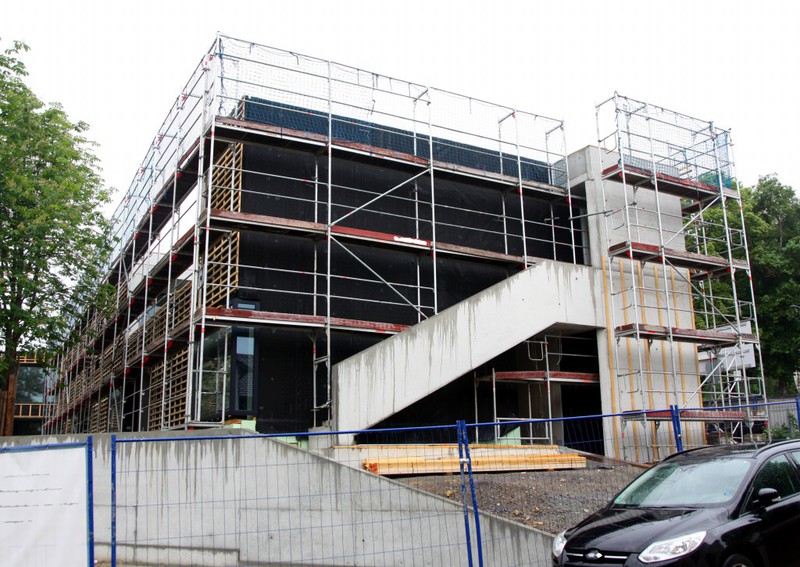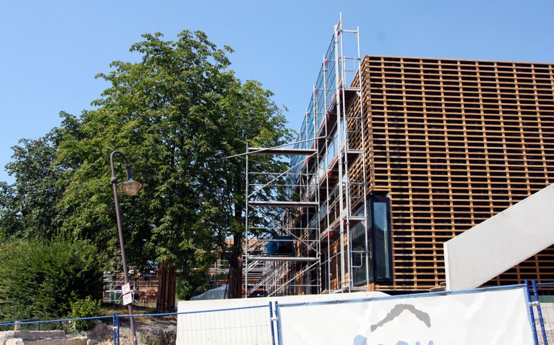 Die Holzfassade wächst weiter. Weshalb an der Südfassade das Gerüst abgebaut wurde, erschließt sich noch nicht. Hier sind nämlich noch keine Holzschindeln angebracht