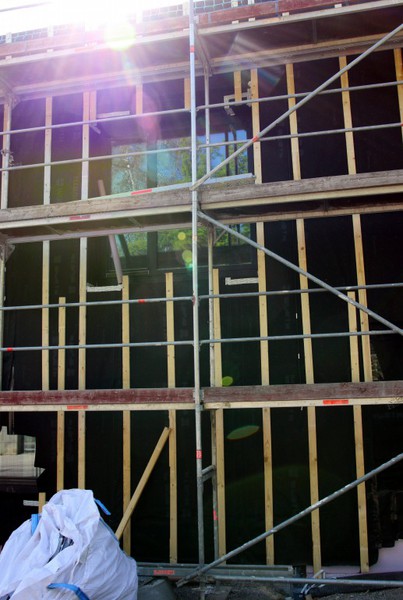 Es ist in den nächsten Wochen zu erwarten, dass die Außendämmung angebracht wird und dann die Holzvertäfelung kommt.