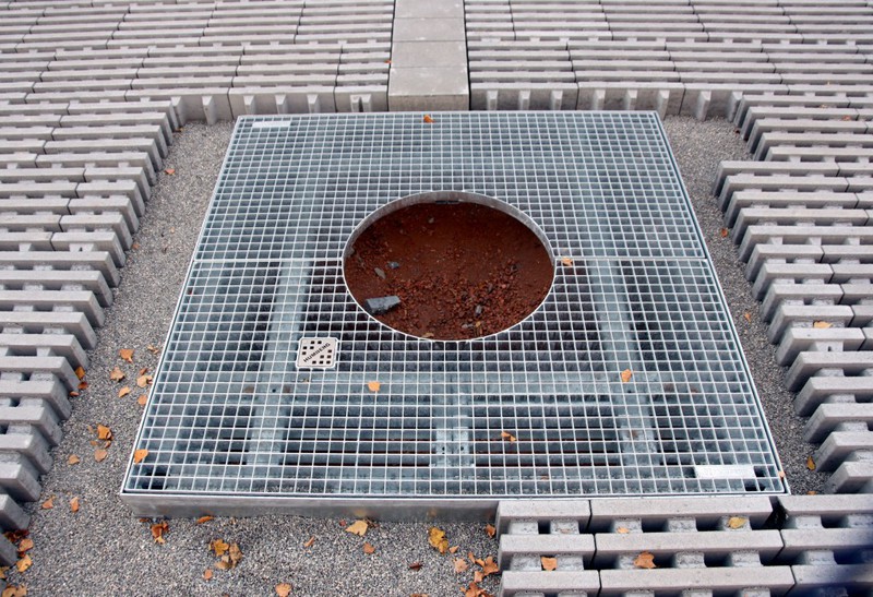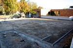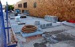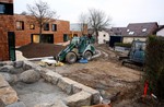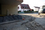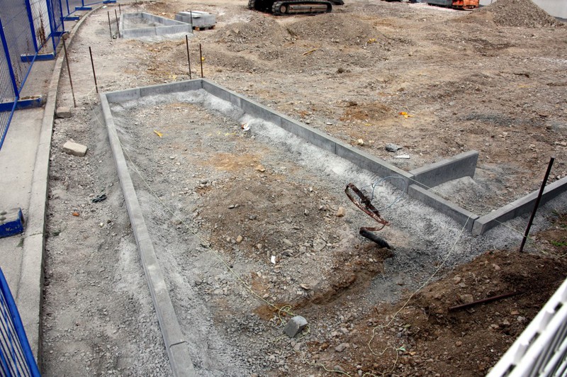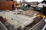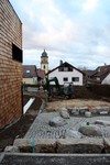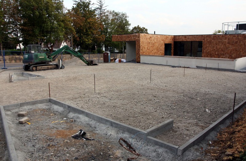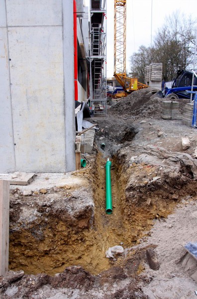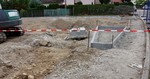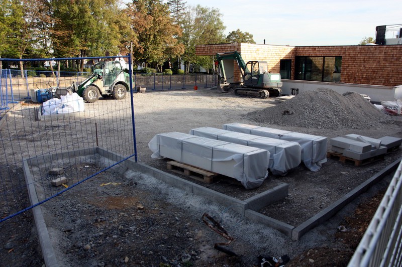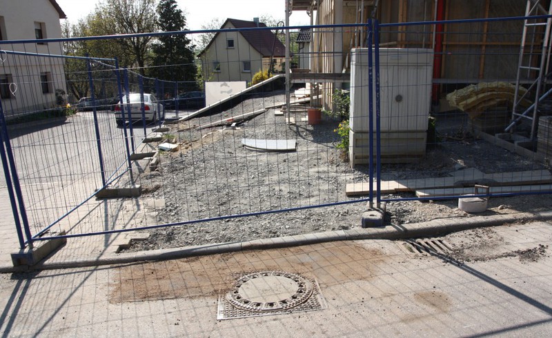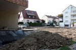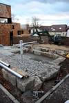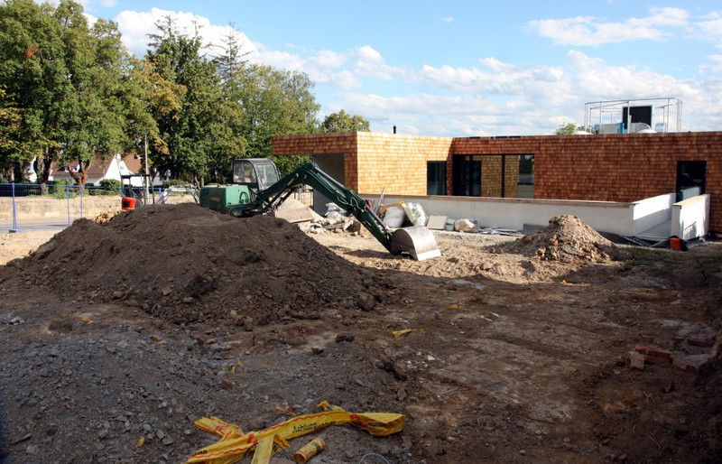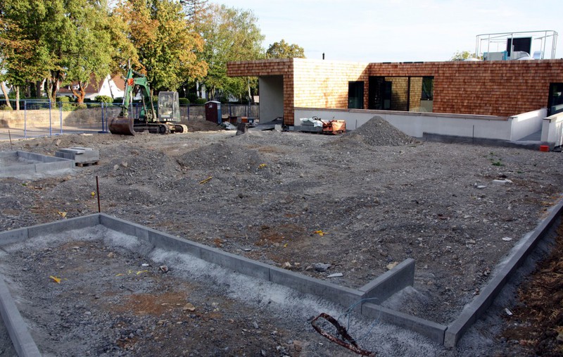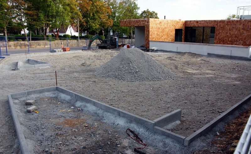 Die Arbeiten an den Außenanlagen gehen gemächlich weiter. In dieser Woche kamen Pflanzstellen für die geplanten Bäume (Kastanien) hinzu. Der Einblick in den Außen- und