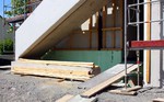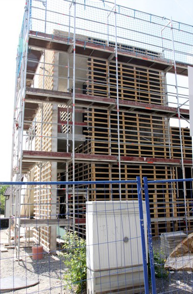 Die Holzfassade hat die Südfassade erreicht und wird an der Fassade zum Außenbereich hin weiterverlegt.
