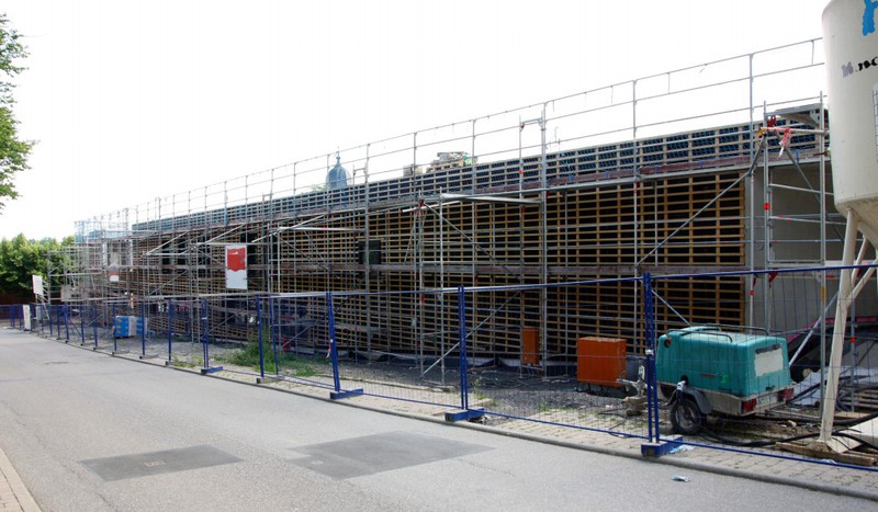 Die Holzvertäfelung wächst. Zudem ist ein Silo mit Verputz aufgestellt worden, was auf die entsprechenden Arbeiten im Innenbereich schließen lässt. Das Gerüst um das Gebäude wurde auch erweitert. Wofür die um 90 Grad am bestehenden Gerüst angebrachten Erweiterungen dienen, wird sich sicherlich noch zeigen…