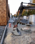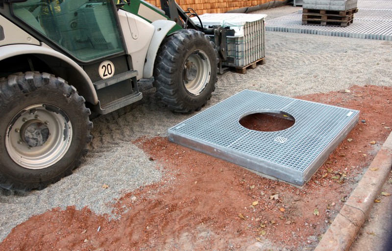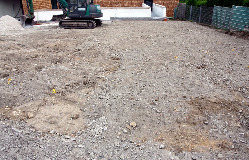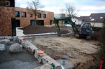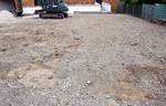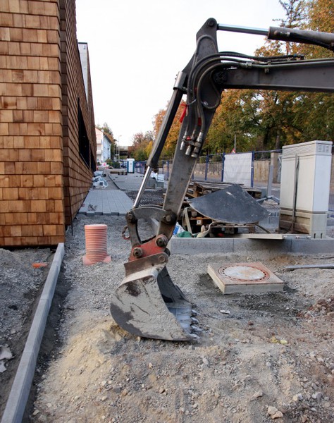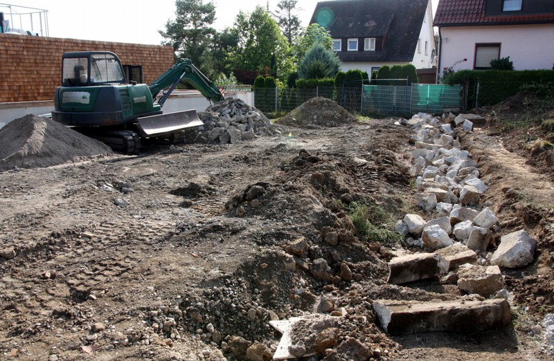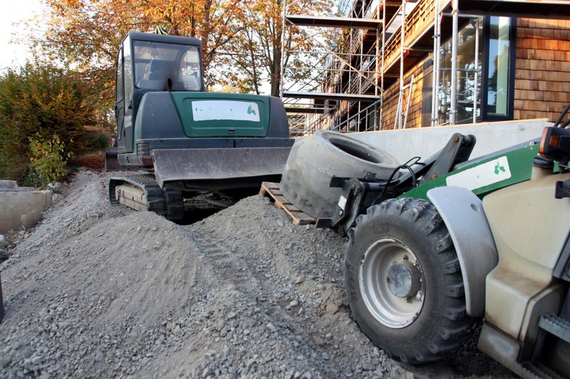 Die Firma für die Erstellung der Außenanlagen ist angerückt und hat bereits am nördlichen Teil des Grundstücks mit den Arbeiten begonnen. Dort entstehen Parkplätze und