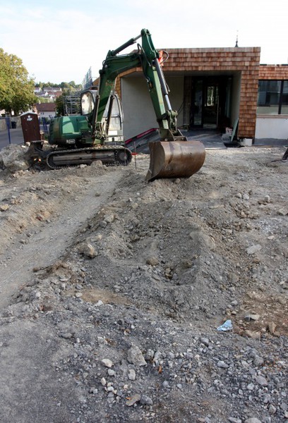 der Straße werden, damit in Summe die 40 versprochenen Parkplätze herauskommen. Derweil zieht es die Bagger auch in den künftigen Außen- uns Spielbereich der KiTa. Die Arbeiten dort sind von