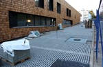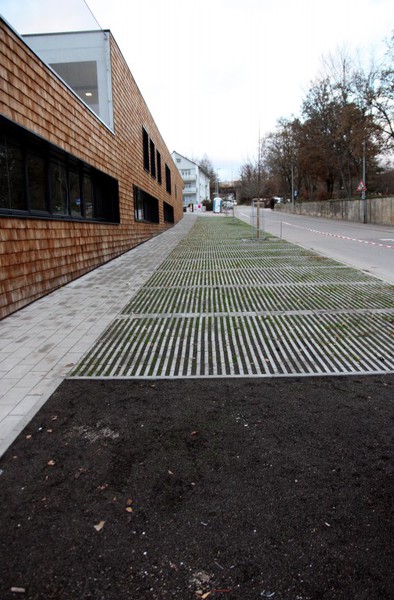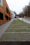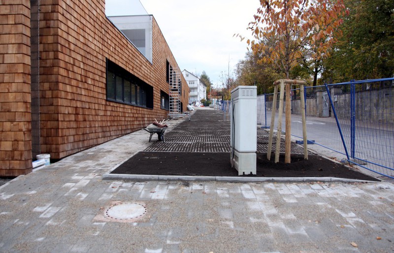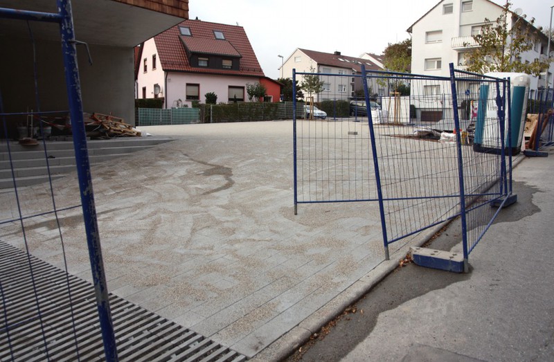 Rassenpflaster entlang der Markgröninger Straße hat auch seine Füllung bekommen. Zudem gab es Fahrradständer oberhalb des Eingangsbereichs und weitere Schutzgitter im Außenbereich der Krippengruppen.