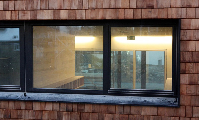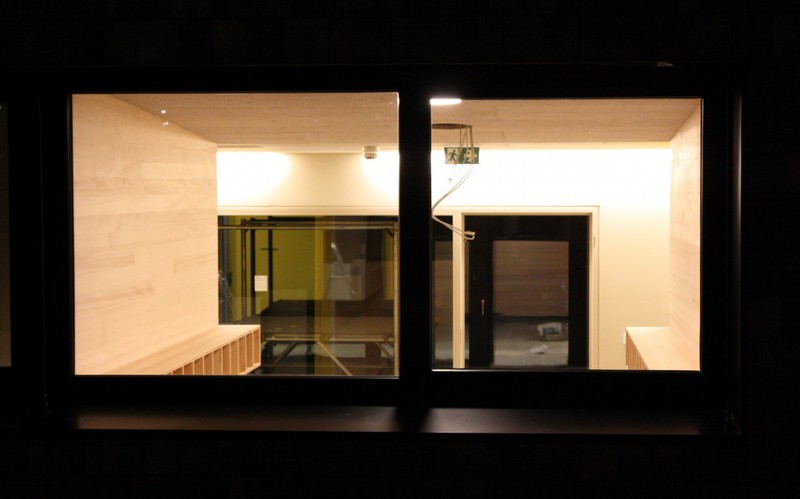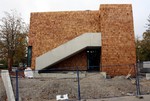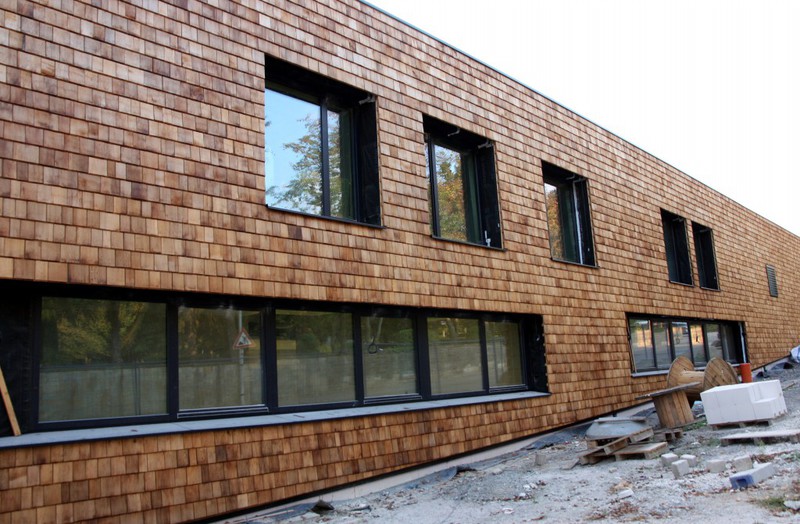 In dieser Woche wurde mit der Holzvertäfelung begonnen. Zwar nur wenige Quadratmeter an einer Stelle, aber so lässt sich die künftige Optik des Gebäudes bereits erkennen.