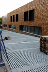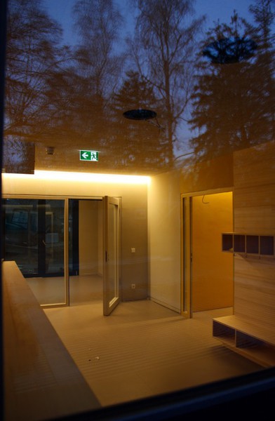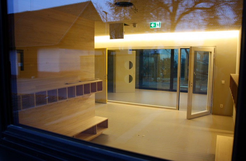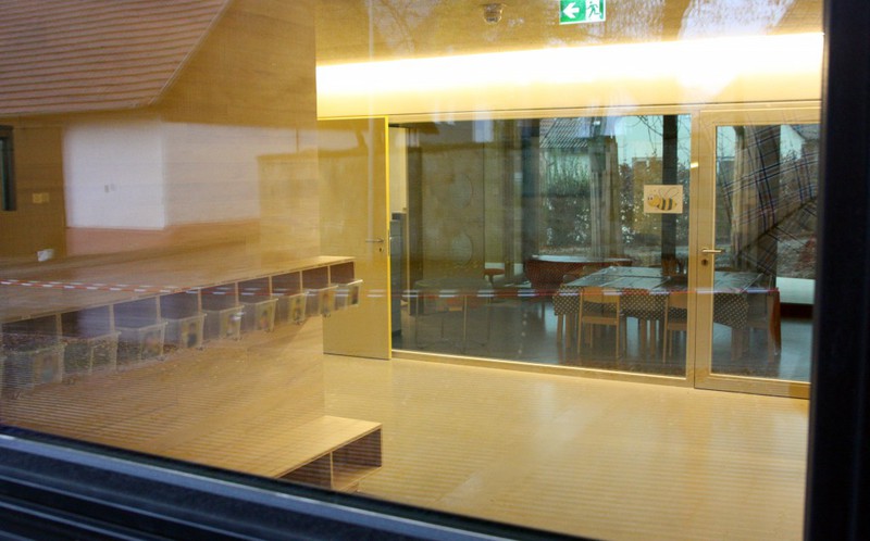 Äußerlich sind nur wenige Veränderungen erkennbar. An der Holzfassade gibt es noch offene Stellen. Im Eingangsbereich des KiTa wurden Schweißbahnen verlegt. Laut der