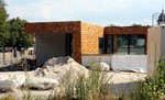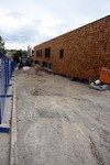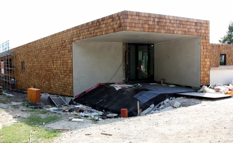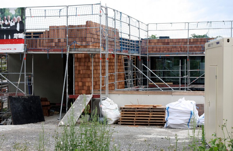 Wie erwartet ruhten in dieser Woche die Arbeiten an der Außenanlage. Die Holzbauer scheinen zum restlichen Anbringen der Holzvertäfelung auch noch nicht aus den Bauferien