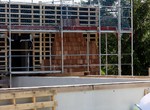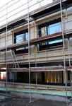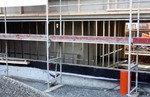 Die Eckfenster sind nun an Ort und Stelle. Im südlichen Gebäudeteil wurde begonnen den Unterbau für die Holzverkleidung anzubringen. Im westlichen Gebäudeteil wurde an