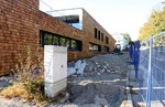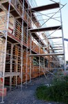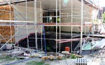 Am südlichen Gebäudeteil steht das Gerüst wieder und das Mitteilungsblatt hatte den Grund für dessen Entfernung offenbart. Die Beton-Außentreppe wurde ersetzt. Bezüglich