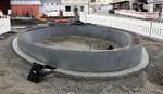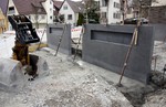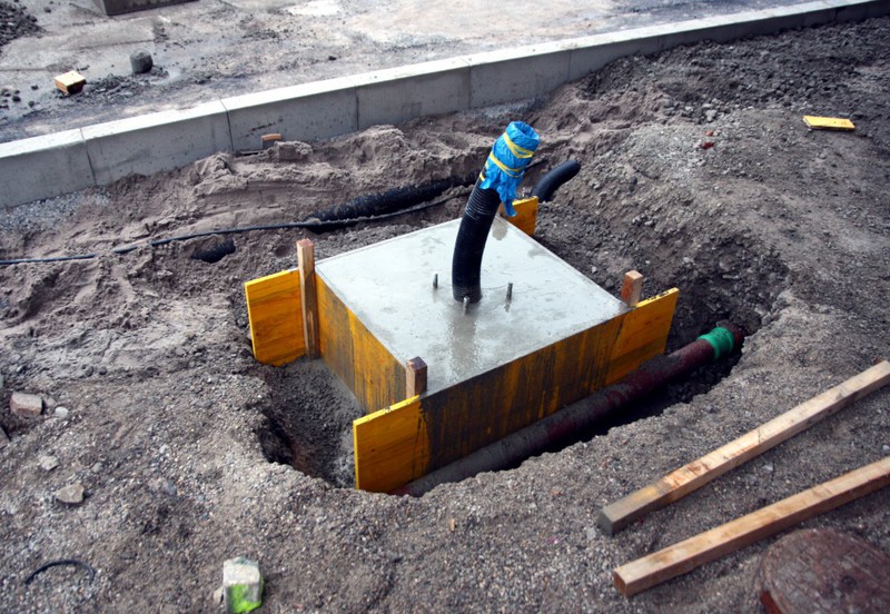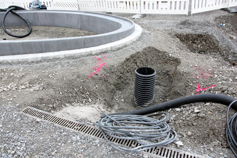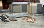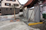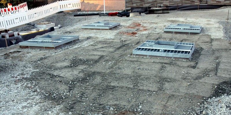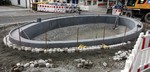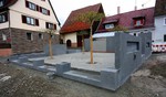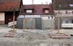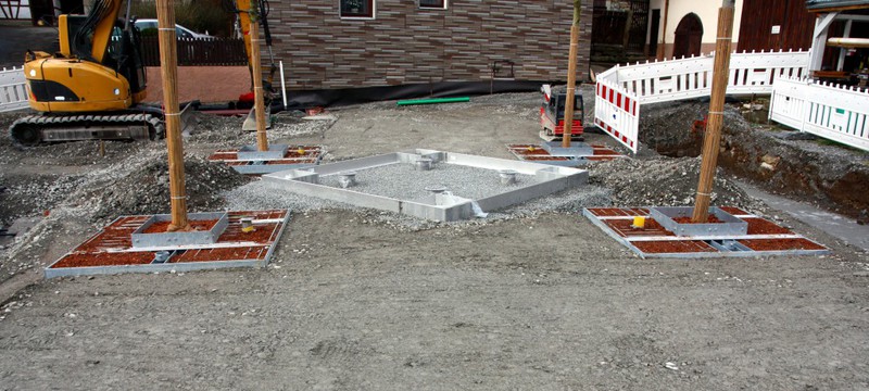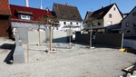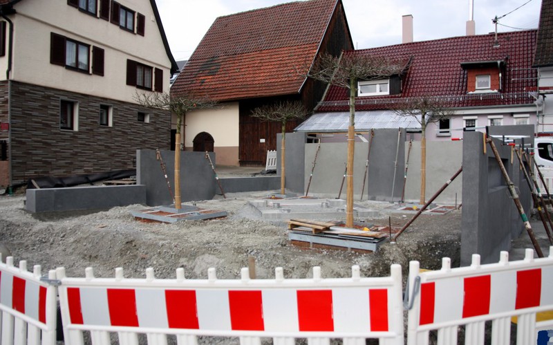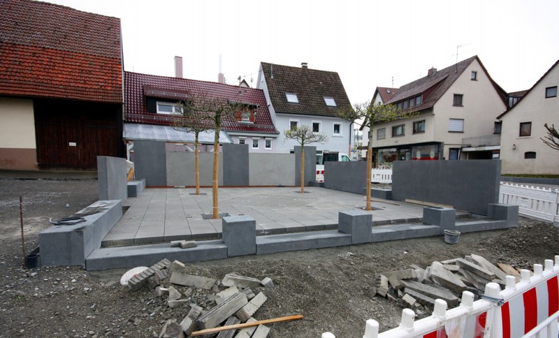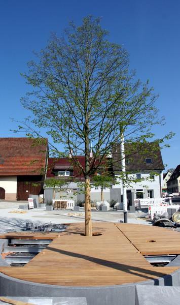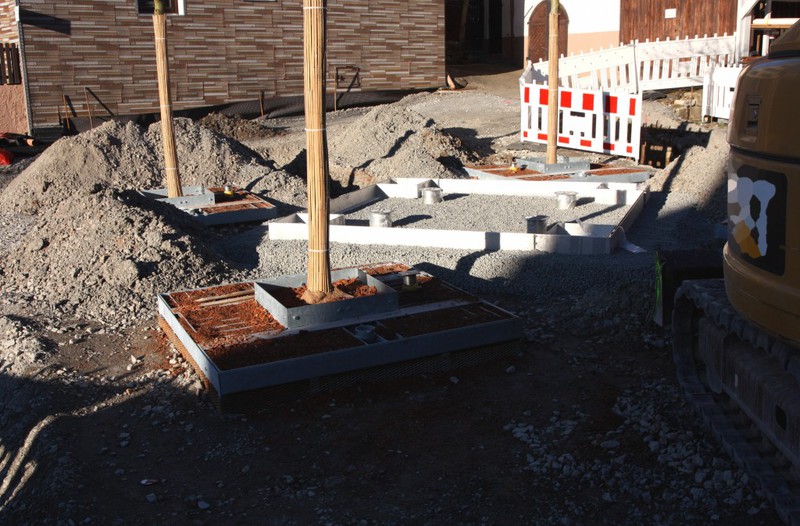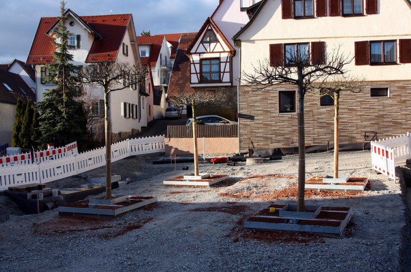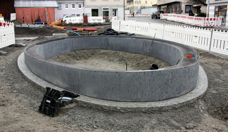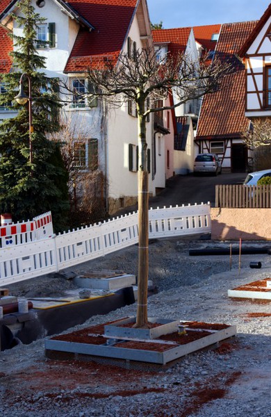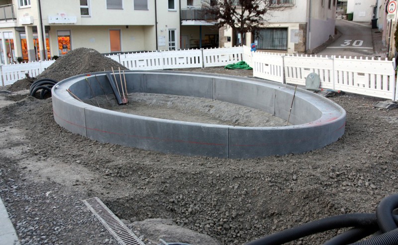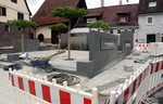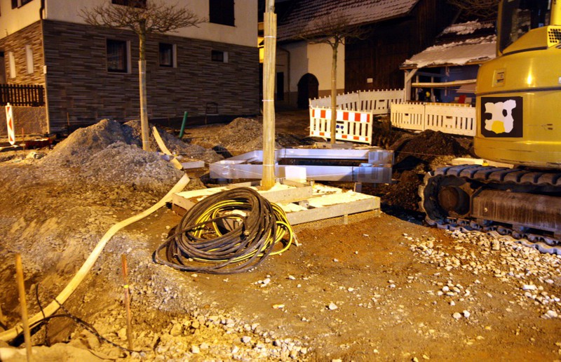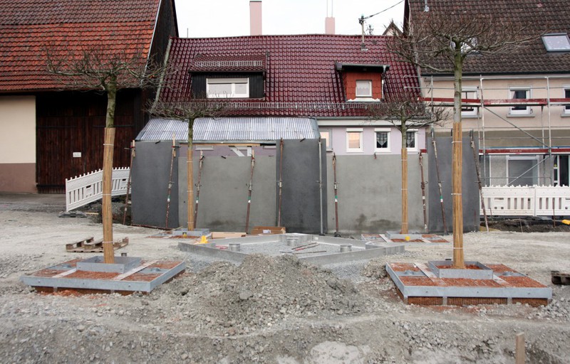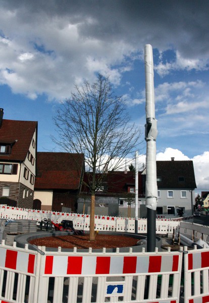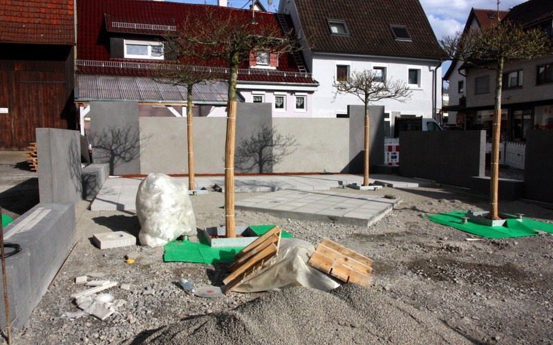 Betonelemente sind bereits da, warten aber noch auf ihren Einbau. Muss für die künftige neue Ortslinde nicht noch ein Baumquartier ins Erdreich eingebaut werden? An der bereits versenkten
