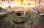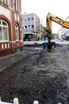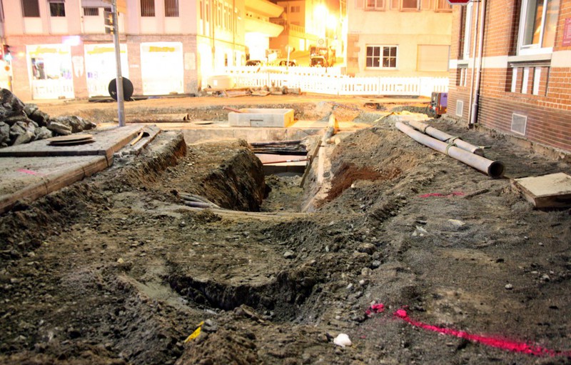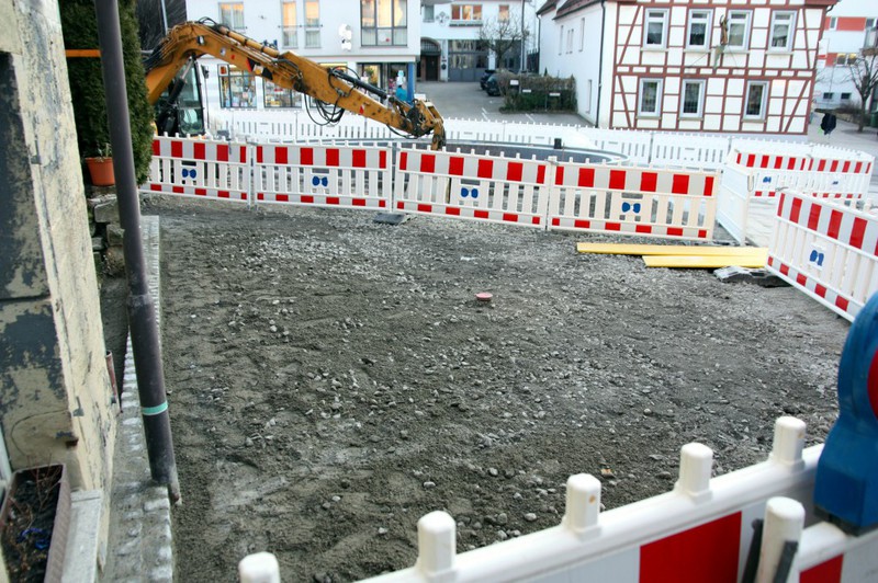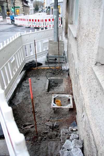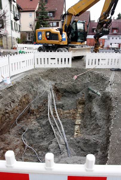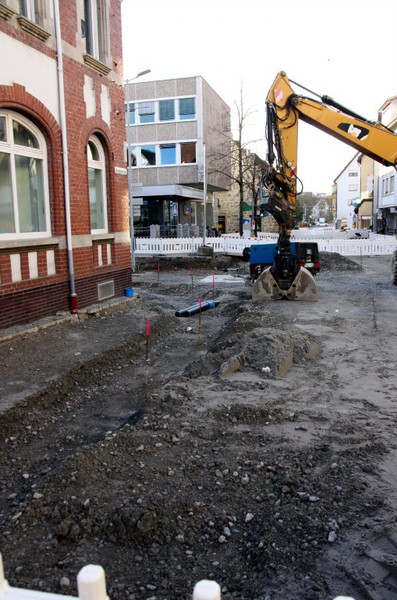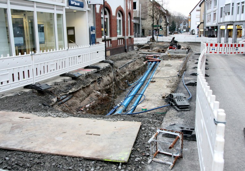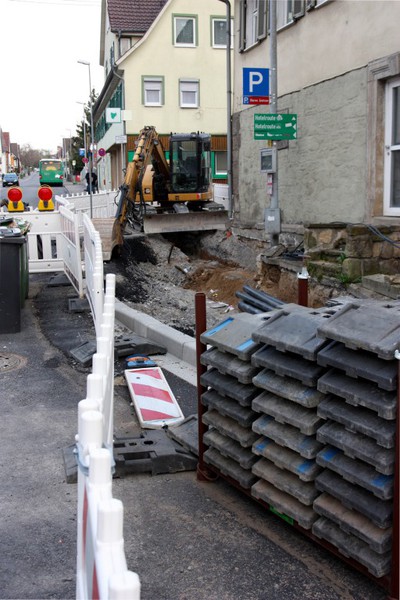 Volle Power an der Bahnhofstraßenkreuzung. Mit Hochdruck werden die alten Leitungen entfernt und neue Wasserleitungen inklusive eines neuen Verteilerschachts gelegt. Die Temperaturen waren frisch, aber es gab keinen Schnee und so konnte der Bautrupp die ganze Woche arbeiten. Der Zeitplan ist ja auch eng gesteckt. Die Gasleitung in Richtung Bahnhofstraße, die eigentlich zu hoch liegt, macht einen Knick in die Tiefe und bekommt damit eine für eine Gasleitung angemessene Einbautiefe. Der zu hoch liegende Teil in der Stuttgarter Straße wird wohl so bleiben.