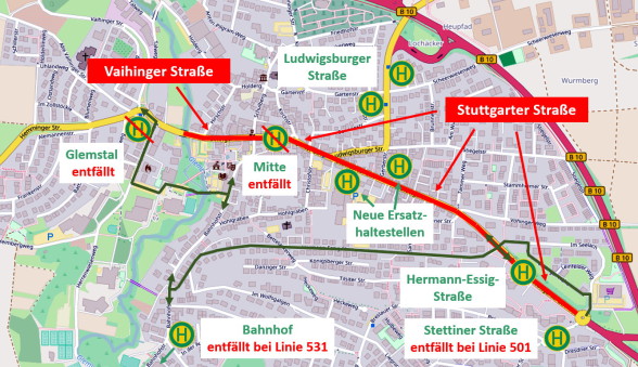 | Linie 531 | Die Haltestelle Schwieberdingen Bahnhof entfällt. Die Linie 531 (einschließlich Schülerverkehr) endet bzw. beginnt in diesem Zeitraum an der Ersatzhaltestelle Schwieberdingen Mitte in der Stuttgarter Straße. |