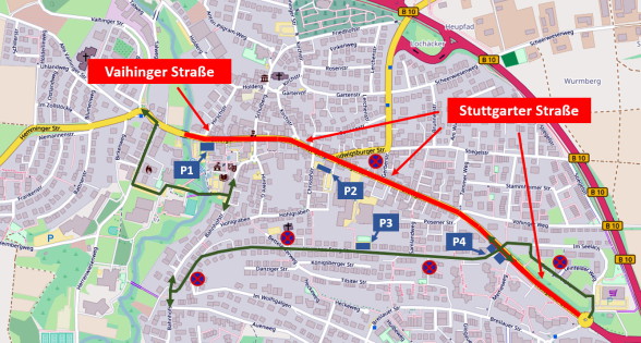 | Bauabschnitt 2 | Vaihinger Straße von der Glems bis zur Bahnhofstraße | 01/2018 – 04/2018 13 Wochen |