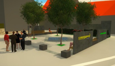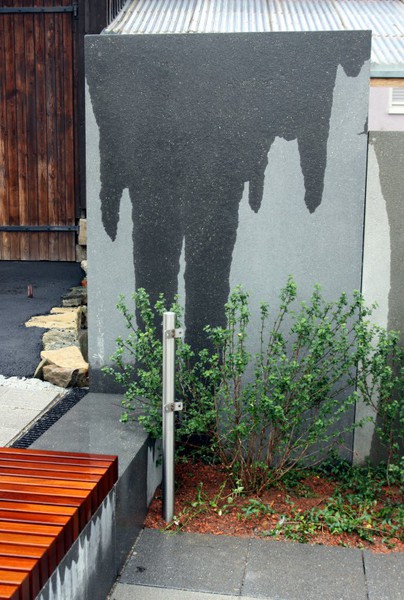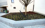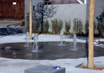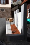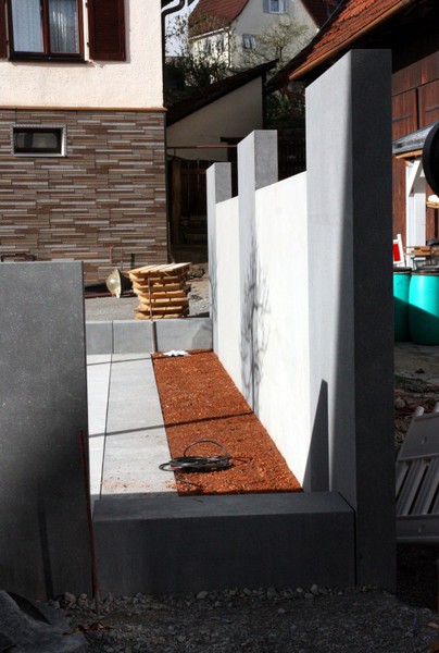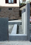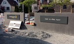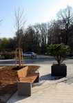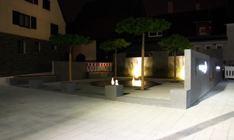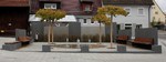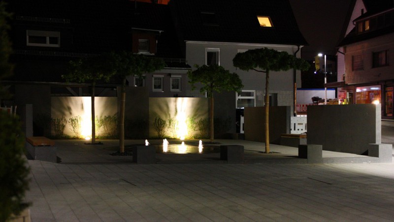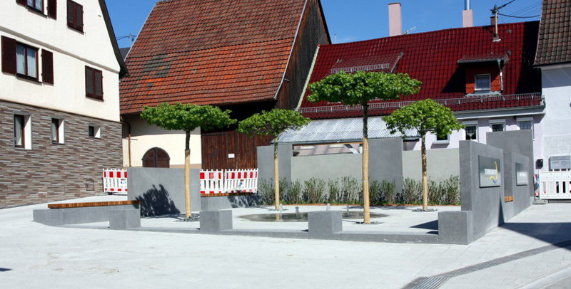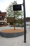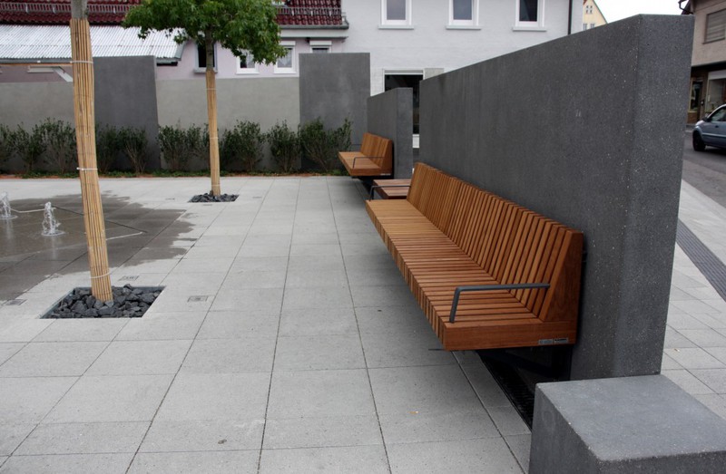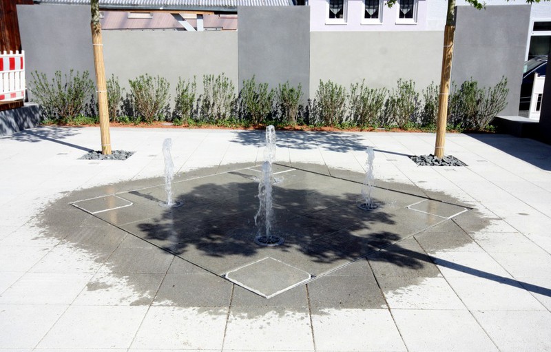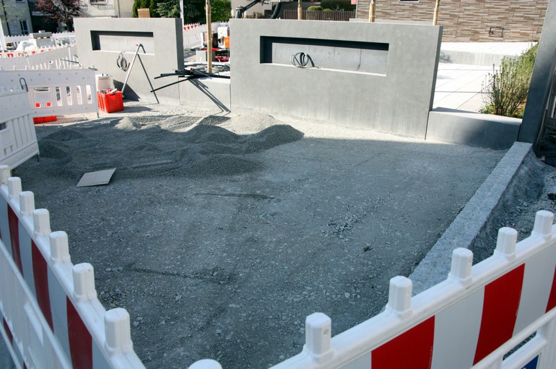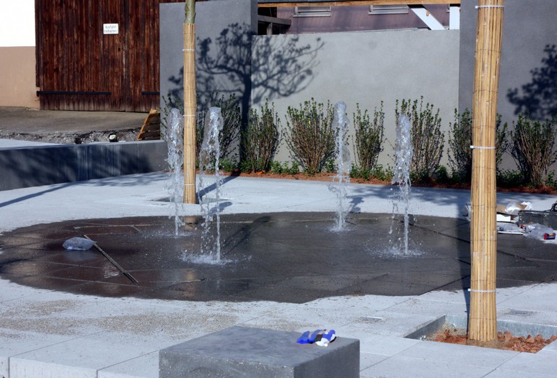 das Wasserspiel sind Bänke an die Wandelemente angebracht worden. Jetzt ist das Ensemble entsprechend der Planung weitestgehend komplett. Fehlt als nächstes noch das Haltestellehäuschen. Warum die